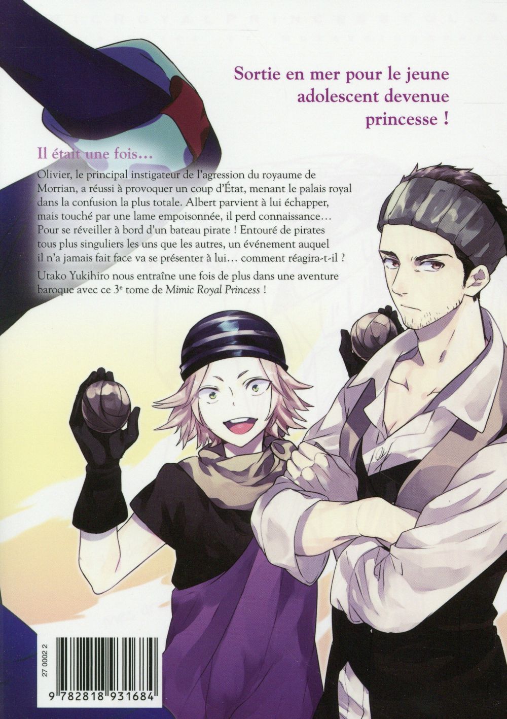 Devenir princesse n’a rien d’un conte de fées... surtout pour un garçon ! Olivier, le principal instigateur de l’agression du royaume de Morrian a réussi à provoquer un coup d’État, menant le palais royal dans la confusion la plus totale. Albert parvient à lui échapper, mais touché par une lame empoisonnée, il perd connaissance. pour se réveiller à bord d’un bateau pirate ! Entouré de pirates tous plus singuliers les uns que les autres, un événement auquel il n’a jamais fait face va se présenter à lui. comment réagira-t-il ? Utako Yukihiro nous entraîne une fois de plus dans l’aventure baroque avec ce 3e volume de Mimic Royal Princess.