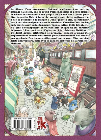 Au détour d’une promenade, Hakumei a découvert un potiron sauvage ! Dès lors, elle se prend d’affection pour la petite courge et décide de s’occuper d’elle jusqu’à ce qu’elle soit à point pour être dégustée. Mais à force de prendre soin de ce potiron, va t-elle se résoudre à le manger ? Jada, quant à elle, va retomber nez à nez bien malgré elle avec le comédien Carnelian, son ancien ami, qu’elle avait précédemment réussi à éviter. Cette fois-ci, elle n’a plus d’échappatoire et va bien être obligée de lui adresser la parole ! Pourquoi tant d’agitation à la résidence Melliflue ? On dirait qu’une célébration se prépare… Mikochi a même été réquisitionnée comme couturière pour confectionner des tenues aux résidents. Des tenues entièrement noires pour fêter un bien triste anniversaire, mais avec le panache habituel de la résidence Melliflue !