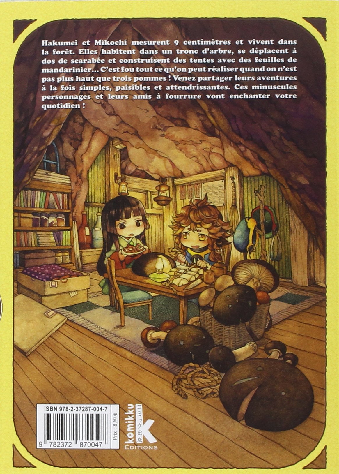 Hakumei et Mikochi mesurent 9 centimètres et vivent dans la forêt. Elles habitent dans un tronc d ?arbre, se déplacent à dos de scarabée et construisent des tentes avec des feuilles de mandarinier ? C ?est fou tout ce qu ?on peut réaliser quand on n ?est pas plus haut que trois pommes ! Venez partager leurs aventures à la fois simples, paisibles et attendrissantes. Ces minuscules personnages et leurs amis à fourrure vont enchanter votre quotidien !