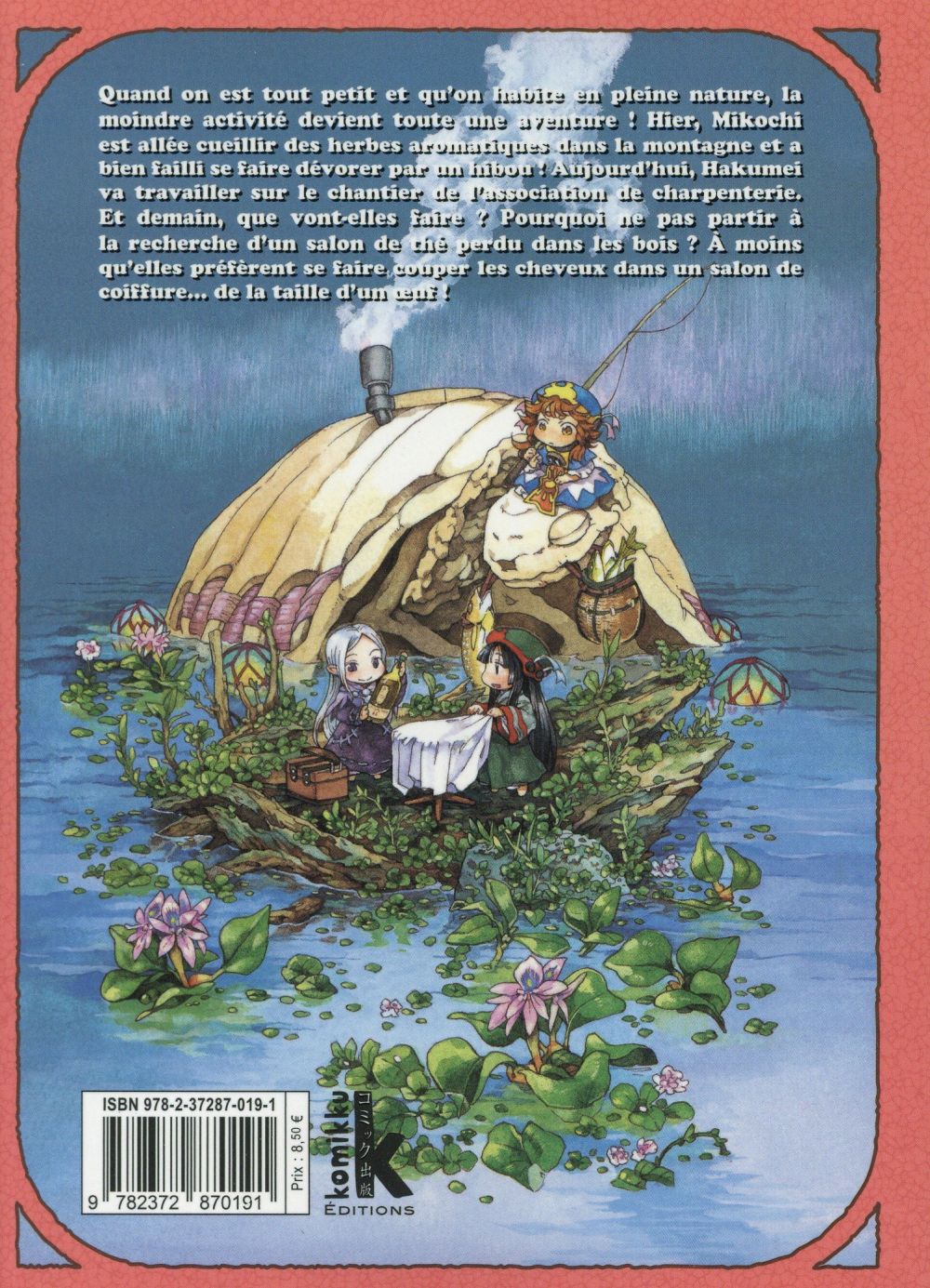 Quand on est tout petit et qu’on habite en pleine nature, la moindre activité devient toute une aventure ! Hier, Mikochi est allée cueillir des herbes aromatiques dans la montagne et a bien failli se faire dévorer par un hibou ! Aujourd’hui, Hakumei va travailler sur le chantier de l’association de charpenterie. Et demain, que vont-elles faire ’ Pourquoi ne pas partir à la recherche d’un salon de thé perdu dans les bois ’ A moins qu’elles préférent se faire, couper les cheveux dans un salon de coiffure... de la taille d’un oeuf !