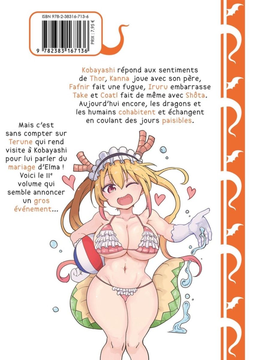 Kobayashi répond aux sentiments de Thor, Kanna joue avec son père, Fafnir fait une fugue, Iruru embarrasse Take et Coatl fait de même avec Shôta. Aujourd’hui encore, les dragons et les humains cohabitent et échangent en coulant des jours paisibles. Mais c’est sans compter sur Terune qui rend visite à Kobayashi pour lui parler du mariage d’Elma ! Voici le 11e volume qui semble annoncer un gros événement ...