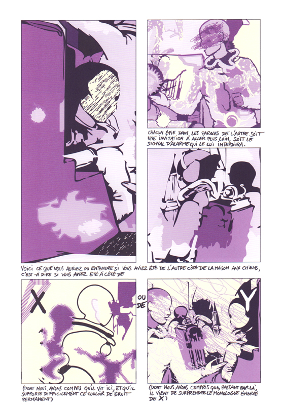 Dans une bande dessinée, on considère ce qu’on voit comme porteur d’une double évidence : l’image ne laisserait rien échapper à notre regard, elle serait l’affirmation d’elle-même rendue plus évidente encore par le récit, dont elle ne serait que le contexte. Et si le fait même de regarder devenait l’objet d’un récit ? S’il n’y était question que de rapports entre différentes façons de regarder, angles de vues, moments du regard ? Et si cette question prenait son sens dans la sphère politique, où un monde, une nation, une cité se construisent en ne donnant à voir que certains points de vue appelés "réalité" ? Dans le chaos apparent des images de "Moins par moins" se dessine une forme d’éducation au regard, une conscience rénovée de la puissance politique des images.