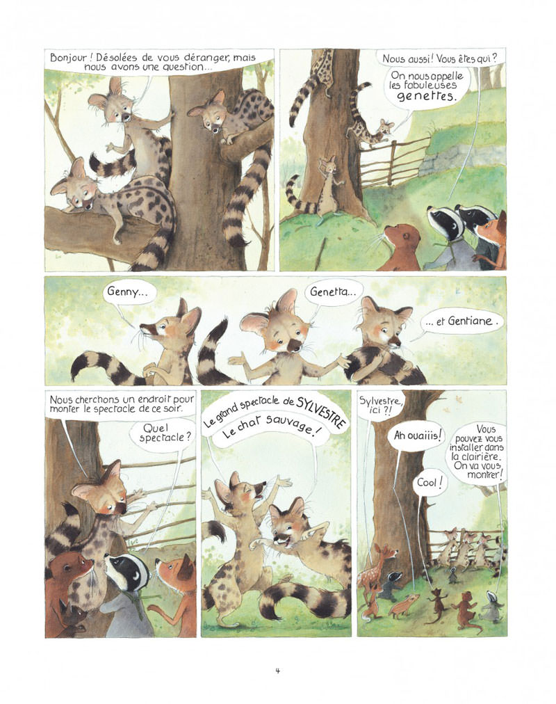 Alors que Roussette, la petite renarde, se pose de plus en plus questions sur ses origines, un chat sauvage, accompagné de genettes, prépare un spectacle destiné à montrer son agilité dans les arbres. Mais ce chat dissimule un secret sur sa véritable identité ; un secret qui va aider Roussette à comprendre que sa nouvelle famille l’aime plus que tout. À travers cette histoire, les auteures abordent autant l’acceptation de la différence que l’idée de rester soi-même et de s’ouvrir aux autres. Le bonheur n’est jamais bien loin !