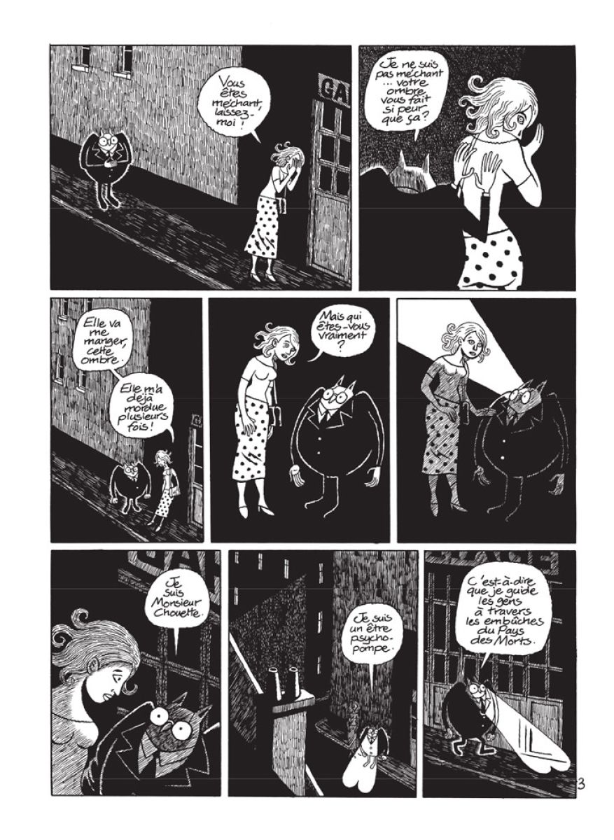 Il fait nuit. Une jeune femme marche en rasant les murs afin d’éviter son ombre dont la forme carnassière l’inquiète. Un curieux personnage l’apostrophe : c’est Monsieur Chouette qui propose de la guider à travers le pays des morts. S’ensuit un voyage aussi fantastique qu’inquiétant... Car au pays des morts, tout est si éphémère, que chaque jour, les immeubles se transforment, poussés par l’arrivée de nouveaux bâtiments morts, tandis que des voitures rejouent continuellement l’accident qui les a menées à la casse. Un monde surpeuplé, où se bouscule une foule bigarrée qui craint plus que tout Cerbère, créature canine au flair infaillible et maître des lieux redoutés. Avec Monsieur Chouette, David B. crée sa propre mythologie et propose une course-poursuite hallucinée et métaphysique dans un au-delà regorgeant d’ombres et de recoins, de gargotes et d’êtres chimériques. Dessiné à l’encre de Chine avec une minutie virtuose, ce Pays des Morts s’avère aussi terrible que merveilleux.
