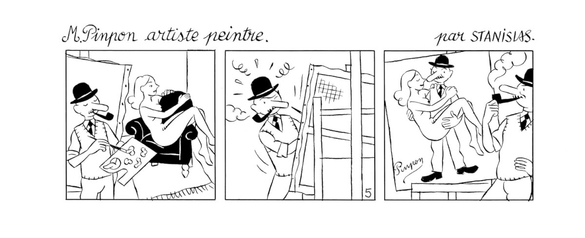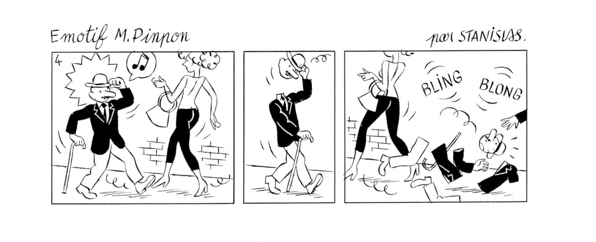 En 1997, paraît Hommage à Monsieur Pinpon, édité par l’Association des Amis de la Vraie Bande Dessinée Française (A.A.V.B.D.F), qui se cache derrière les membres fondateurs de l’éditeur L’Association dessinant tous ensemble ce cadeau pour leurs adhérents. Monsieur Pinpon est né dans ce recueil sous forme de strips et c’est bien ce personnage que reprend Stanislas dans ces 100 histoires inédites dessinées en noir et blanc dans un format strip. L’élégance du trait mélangé à de savoureuses histoires pleines d’humour, de nonsense et de poésie prolongent le plaisir de retrouver enfin ce charmant Monsieur Pinpon.