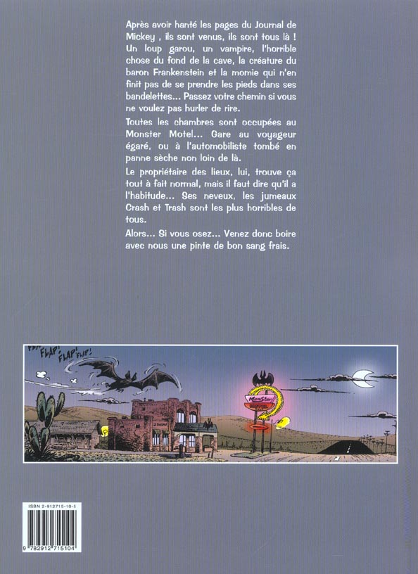 Après avoir hanté les pages du Journal de Mickey, ils sont venus, ils sont tous là ! Un loup garou, un vampire, l’horrible chose du fond de la cave, la créature du baron Frankenstein et la momie qui n’en finit pas de se prendre les pieds dans ses bandelettes. Passez votre chemin si vous ne voulez pas hurler de rire. Toutes les chambres sont occupées au Monster MoteL. Gare au voyageur égaré, ou à l’automobiliste tombé en panne sèche non loin de là. Le propriétaire des lieux, lui, trouve ça tout à fait normal, mais il faut dire qu’il a l’habitude. Ses neveux, les jumeaux Crash et Trash sont les plus horribles de tous. Alors... si vous osez... venez donc boire avec nous une pinte de bon sang frais.