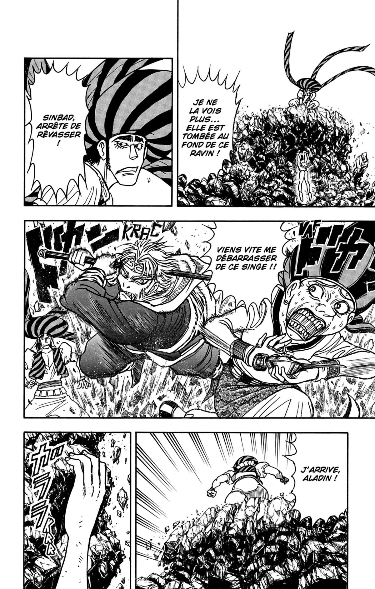 Pour détruire tous les récits imaginaires extérieurs aux Contes des mille et une nuits, le mystérieux maître Tyltyl doit s’approprier le maillet enchanté : pour ce faire, il a convoqué le chef Hiraga, et Engekibu sera sa monnaie d’échange... Mais sur les lieux de la transaction, l’otage met son grain de sel dans le combat qui oppose Aladin et Sinbad à celui qui s’est révélé n’être autre que Son Gokû... et la demoiselle chute au fond d’une crevasse béante ! Que va-t-il advenir d’elle !