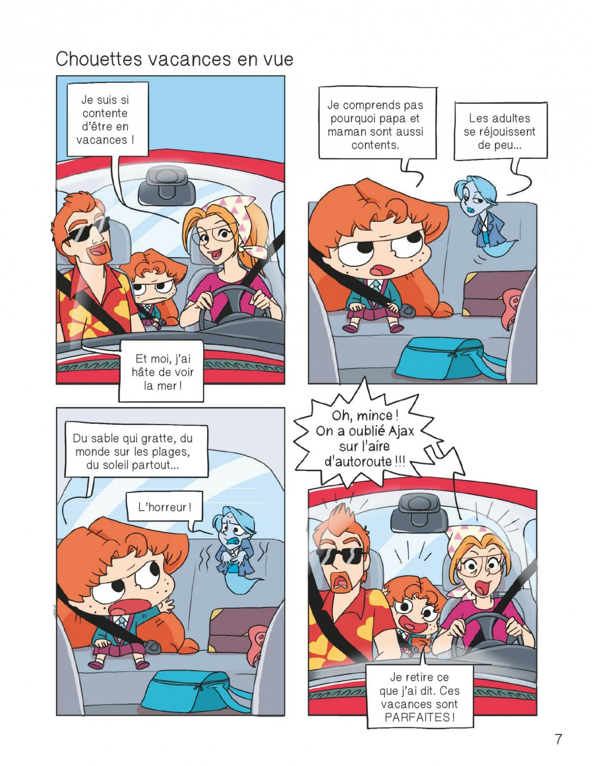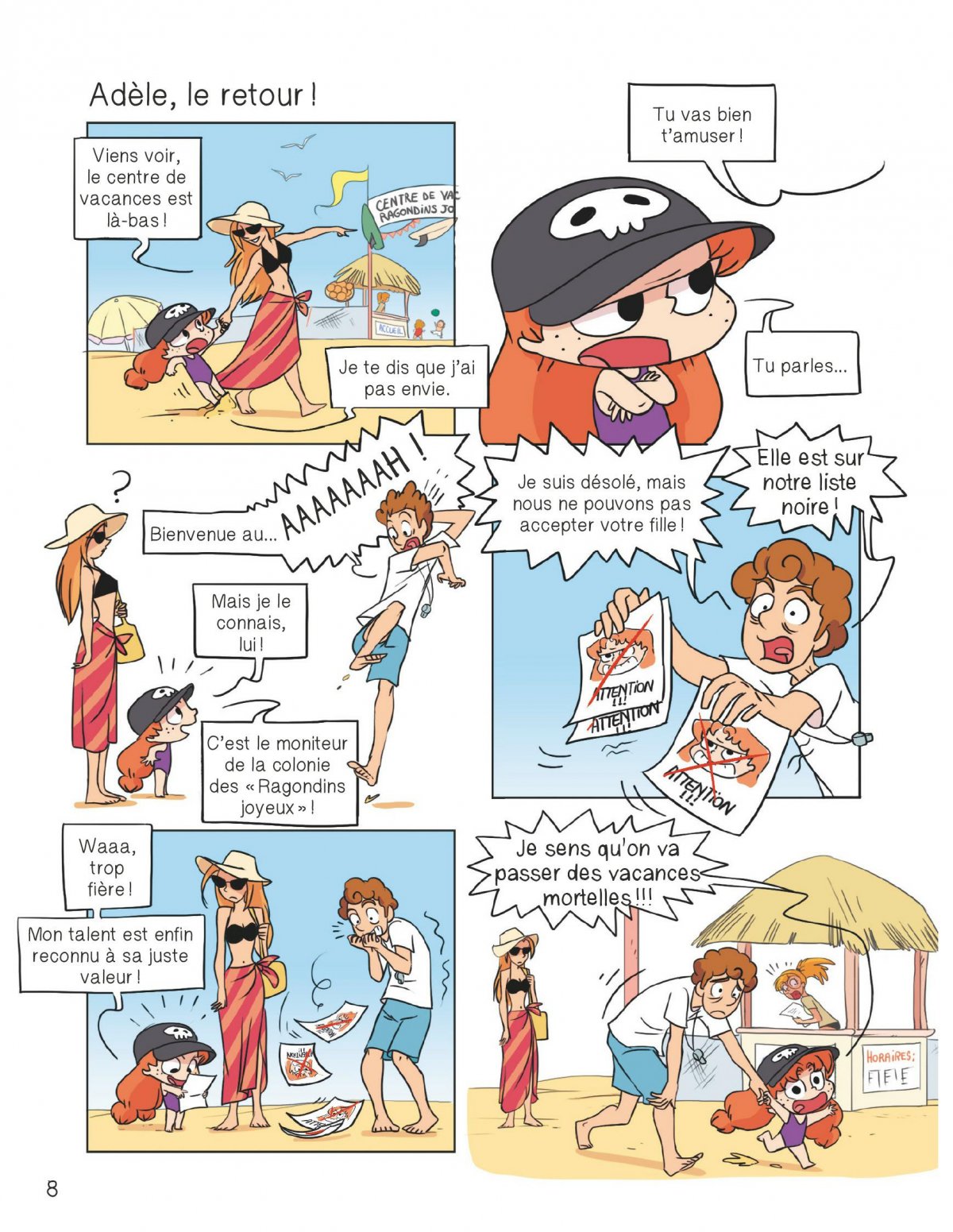 Mortelle Adèle part se prélasser au soleil ! Et, ce qui est sûr, c’est qu’elle n’a rien oublié dans sa valise : lunettes de soleil, casquette, maillot de bain... et bêtises en tous genres ! Mais alors qu’elle avait tout prévu, Adèle retrouve de vieilles connaissances : les moniteurs de la colonie des Ragondins joyeux qui gèrent désormais le centre aéré de la plage. Hé hé, ces retrouvailles vont être mortelles !