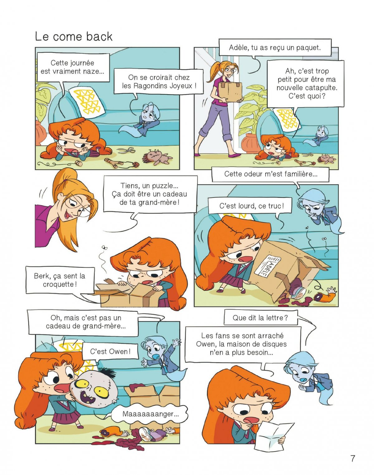 Owen le zombie, création d’Adèle un peu encombrante, était dans les tomes précédents devenu une star de boy’s band... Sauf que, ce coup-ci, le revoici à la maison