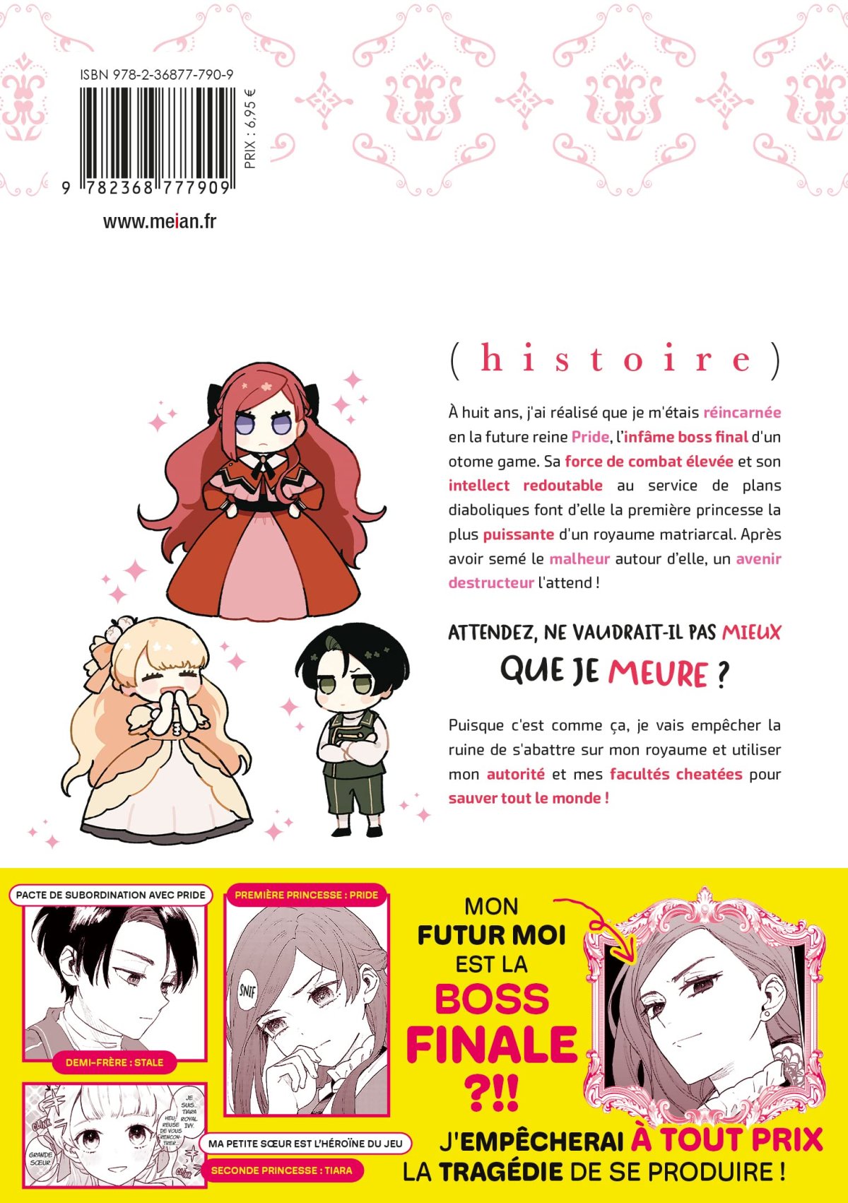 À huit ans, j’ai réalisé que je m’étais réincarnée en la future reine Pride, l’infâme boss final d’un otome game. Sa force de combat élevée et son intellect redoutable au service de plans diaboliques font d’elle la première princesse la plus puissante d’un royaume matriarcal. Après avoir semé le malheur autour d’elle, un avenir destructeur l’attend