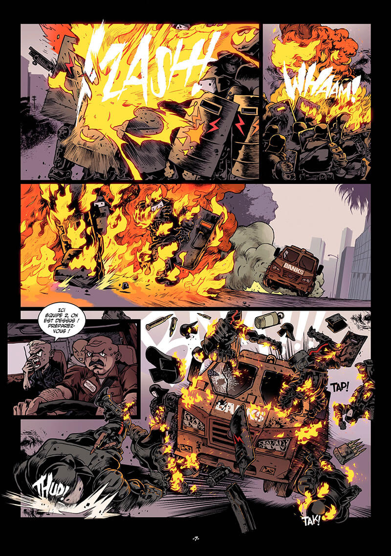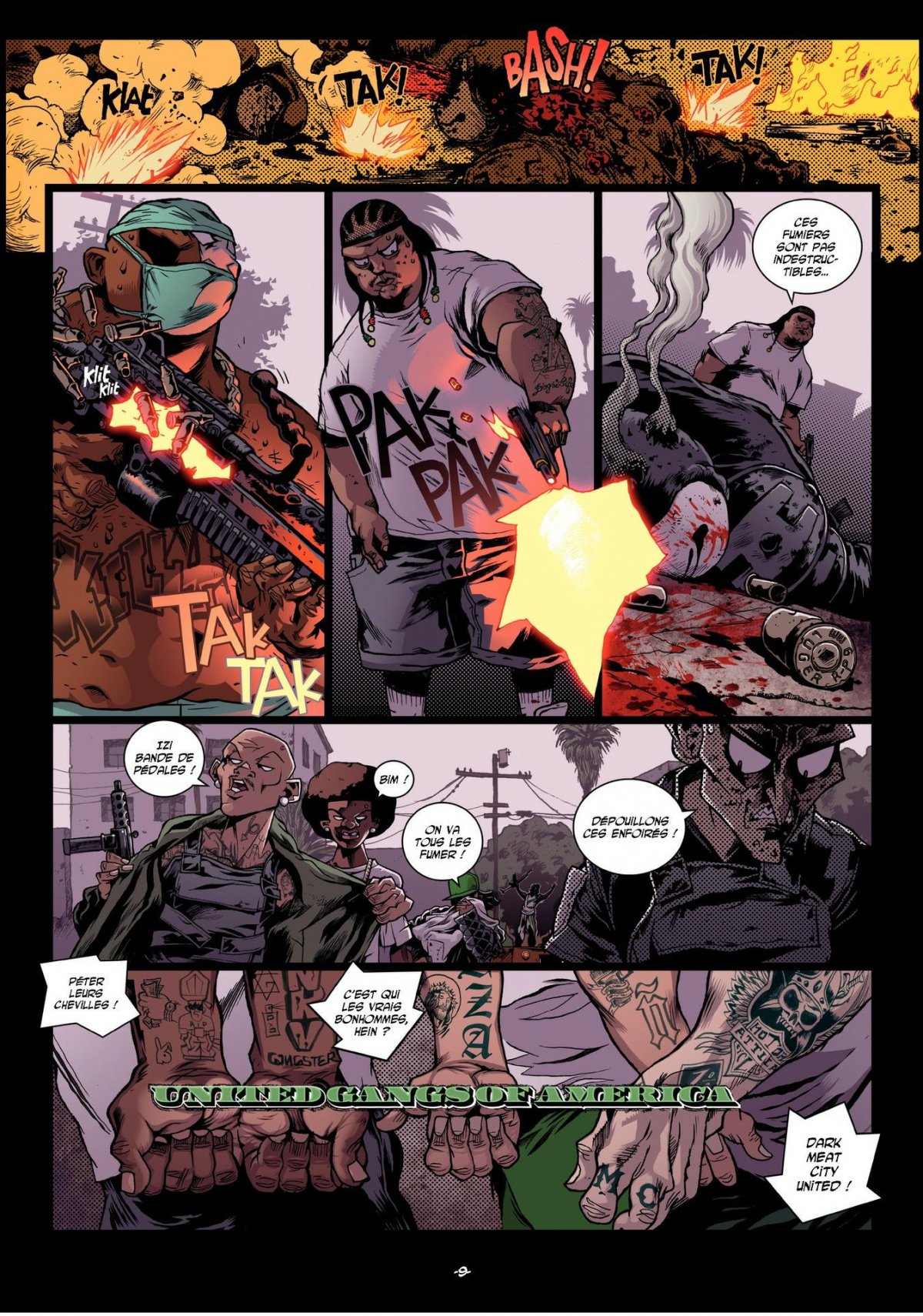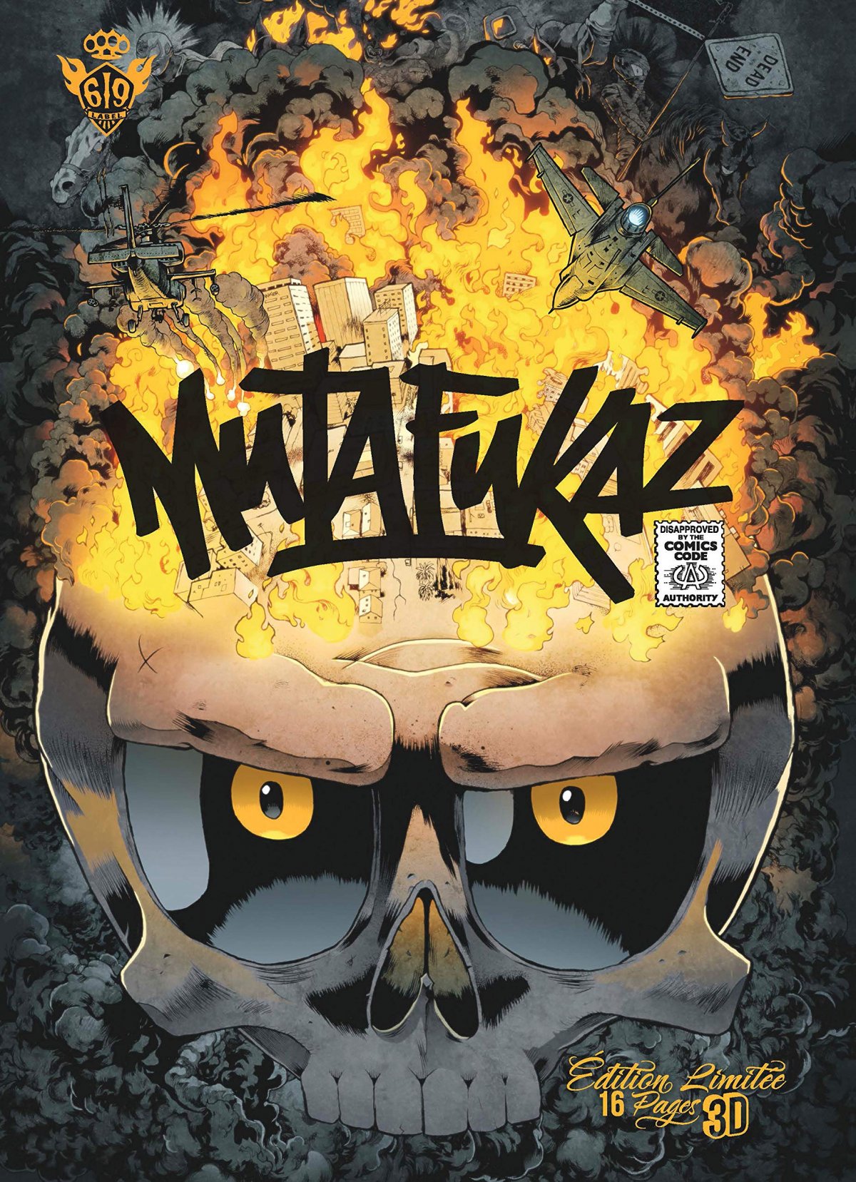 Dark Meat City est en proie à des émeutes grandissantes, qui s’apparentent de plus en plus à une guerre civile : la répression de la section Z-7 est si féroce que les pires gangs de la ville et les citoyens rebelles se réunissent sous une couleur commune et revendicatrice, le vert. Alors que la ville est le théâtre de violentes batailles rangées, Angelino, Vinz et Willy, enfin réunis et toujours aussi losers, décident de retourner à Povera Height, le quartier de Willy, qui prétend posséder une grosse somme d’argent cachée sous le plancher du taudis qui lui sert de maison. Mais l’invasion Macho se précipite et transforme Dark Meat City en un brasier infernal dont nul ne semble pouvoir réchapper... dévoilant au passage de terrifiantes aptitudes chez Angelino ! Destruction de Dark Meat City, cavaliers de l’Apocalypse, invasion d’insectes géants et roues d’Ezechiel, cet avant-dernier tome de Mutafukaz est un véritable clin d’oeil aux textes bibliques de St Jean, et un immense hommage aux films catastrophe ad Inferno.