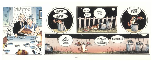Premier recueil inédit en France des strips du dimanche en couleur de l’année 2000 qui mettent en scène un chien Earl et un chat Mooch. Ce spécialiste du comics, co-auteur de Krazy Kat : The Comic Art of George Herriman, dessine depuis 1994 ces délicieuses aventures animalières qui paraissent dans 700 quotidiens. Chaque strip insiste sur les relations entre les deux protagonistes et leurs maîtres en introduisant toute une galerie de personnages. Tendres, attachantes et drôles ces histoires connaissent un grand succès international avec près de 18 recueils édités à ce jour et récompensés par de nombreux prix. Tous ces strips du dimanche sont introduits par un logo qui rend hommage ou parodie des oeuvres de peintres, dessinateurs, musiciens et réalisateurs. « Un des meilleurs strips de tous les temps » pour Charles Schulz. « Mutts est avec Les Peanuts, Pogo, Krazy Kat, Calvin et Hobbes, un strip intelligent et drôle, brillamment dessiné et très touchant » pour Matt Groening, le créateur des Simpson. Cette édition du premier volume qui en comprendra trois bénéficie d’une traduction de Marc Voline.
