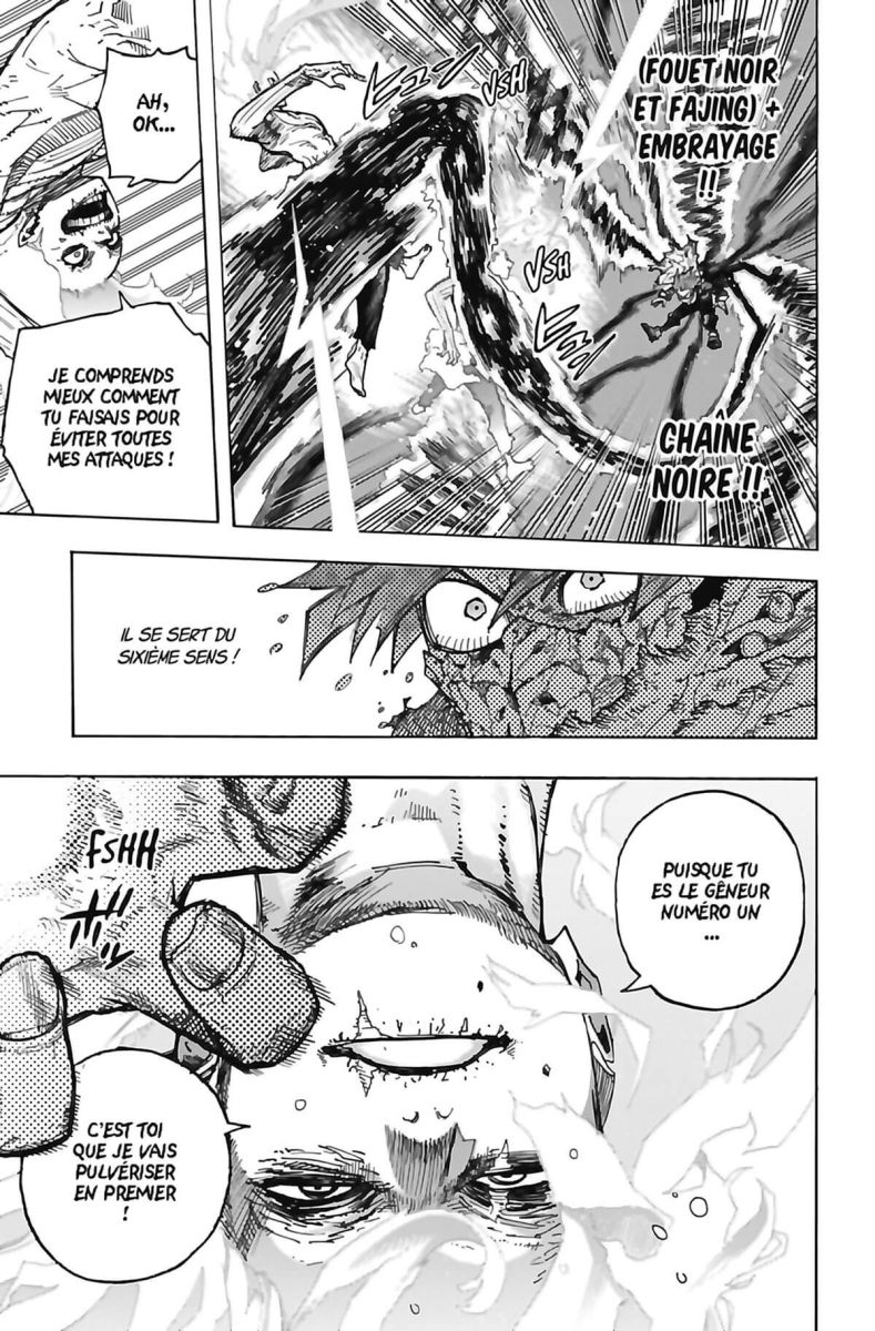 C’est alors que le pire arrive : il parvient à toucher son adversaire et à s’emparer du sixième sens ! Deku, affaibli par le contrecoup de l’embrayage et privé d’une partie de sa force, pourra-t-il tenir ?