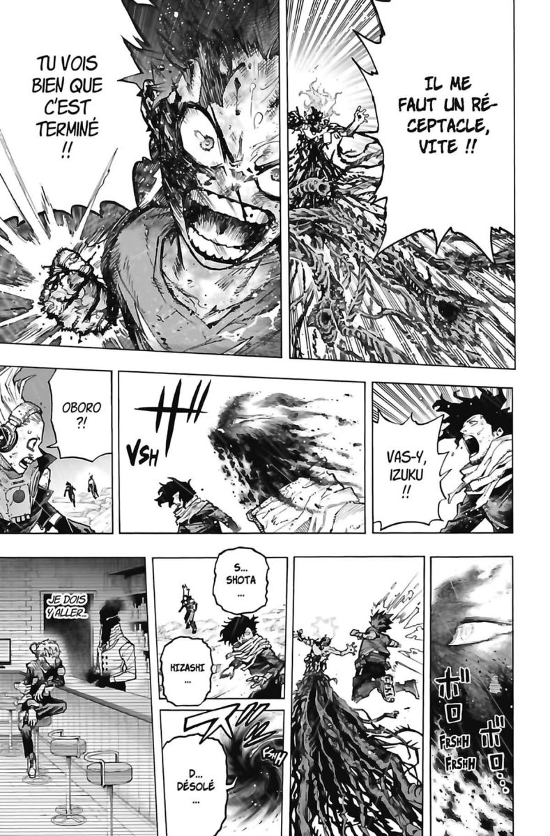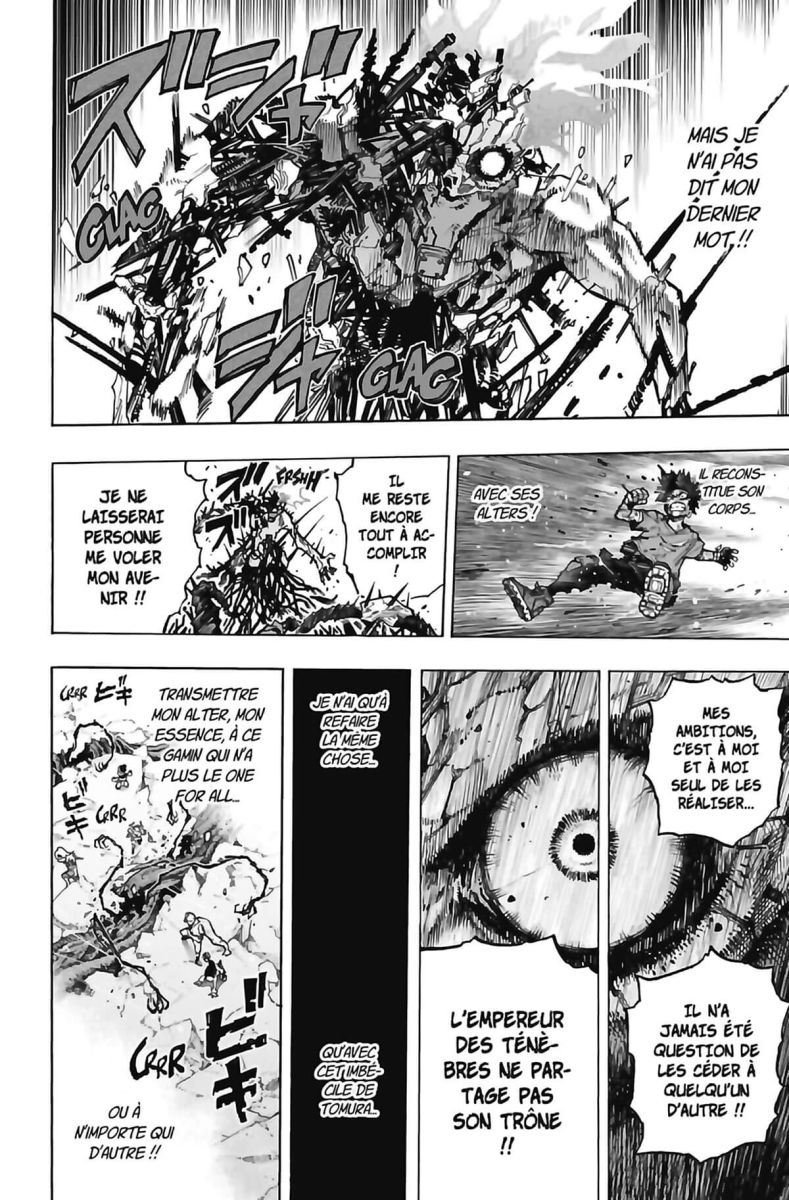 À travers le One for All, Deku parvient à atteindre l’inconscient de Tomura et à lui tendre la main... C’est alors que l’horrible vérité apparaît : le jeune homme n’a jamais été libre de ses choix, c’est All for One qui lui a tracé un chemin depuis le tout début ! Sous le choc, sa conscience vacille et laisse la place à celle de son ancien professeur...