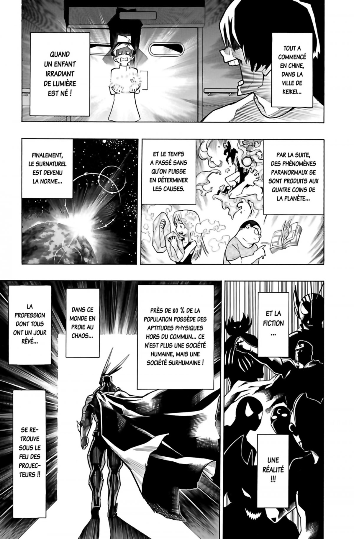 Dans un monde où 80 % de la population possède un super ? pouvoir appelé alter, les héros font partie de la vie quotidienne. Et les super ? vilains aussi ! Face à eux se dresse l’invincible All Might, le plus puissant des héros ! Le jeune Izuku Midoriya en est un fan absolu. Il n’a qu’un rêve : entrer à la Hero Academia pour suivre les traces de son idole. Le problème, c’est qu’il fait partie des 20 % qui n’ont aucun pouvoir... Son destin est bouleversé le jour où sa route croise celle d’All Might en personne ! Ce dernier lui offre une chance inespérée de voir son rêve se réaliser. Pour Izuku, le parcours du combattant ne fait que commencer !