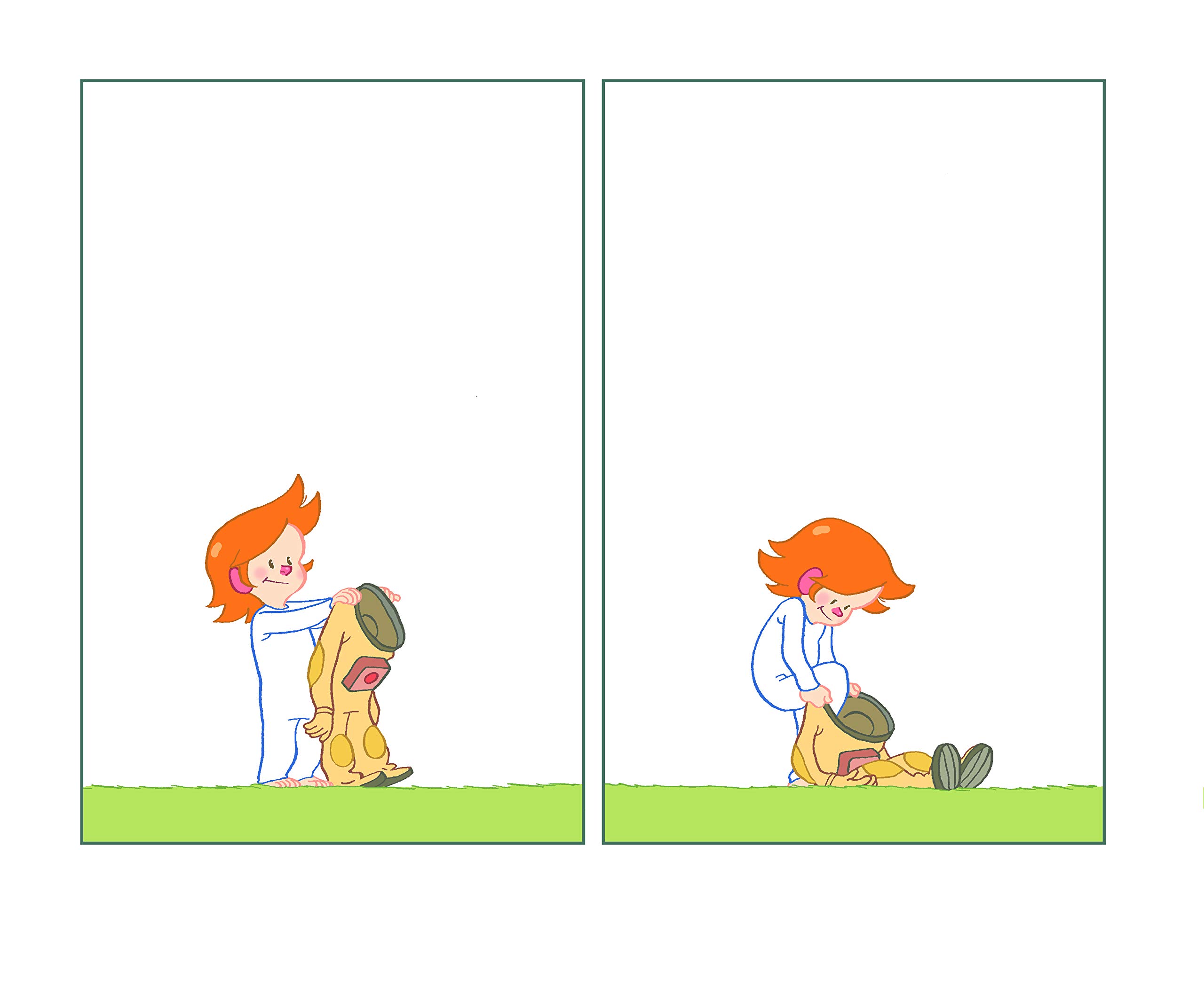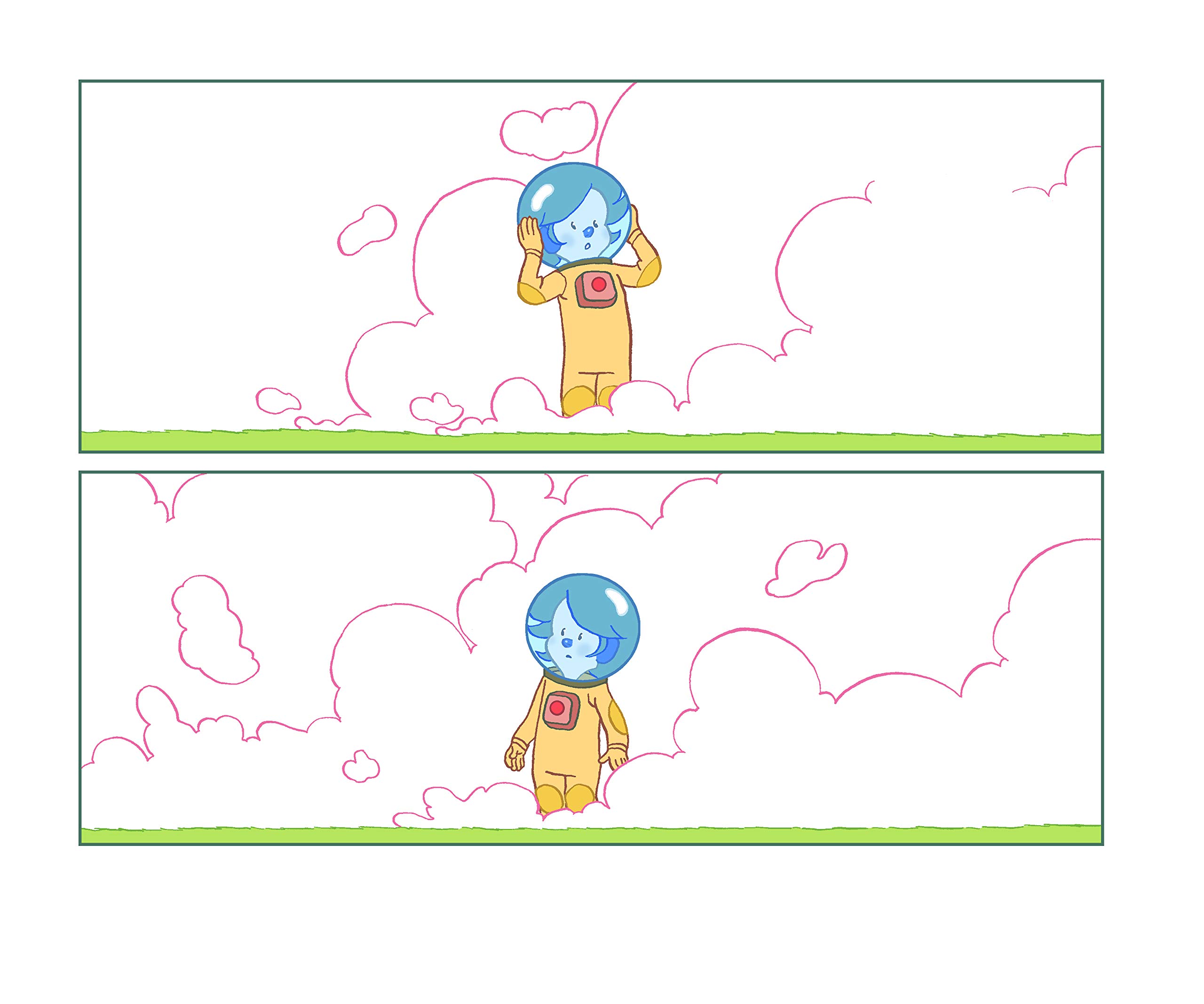 L’histoire commence avec Myrmidon faisant tranquillement du vélo, lorsqu’il heurte une pierre. Myrmidon vole, se rattrape à une combinaison d’astronaute avec laquelle il se pose sur le sol. Il l’enfile, le voilà paré pour la suite de son aventure. Un casque roule jusqu’à ses pieds, de la fumée jaillit. Ni une, ni deux, il met le casque et avance à tâtons. Il se cogne contre une échelle qui mène jusqu’à un drôle de vaisseau et là, un petit homme vert arrive. Les ennuis ne font que commencer !