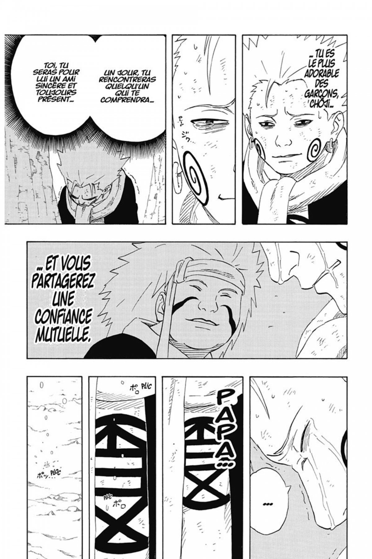 Blessé dans son orgueil, Chôji triomphe de Jirôbô, mais s’effondre à l’issue du combat... Déterminés à tuer chacun un ennemi, Shikamaru, Naruto, Neji et Kiba se dressent face aux ninjas d’Oto ! Fort de son Byakugan, le descendant des Hyûga provoque Kidomaru, le combattant araignée ! Un duel à mort s’engage...