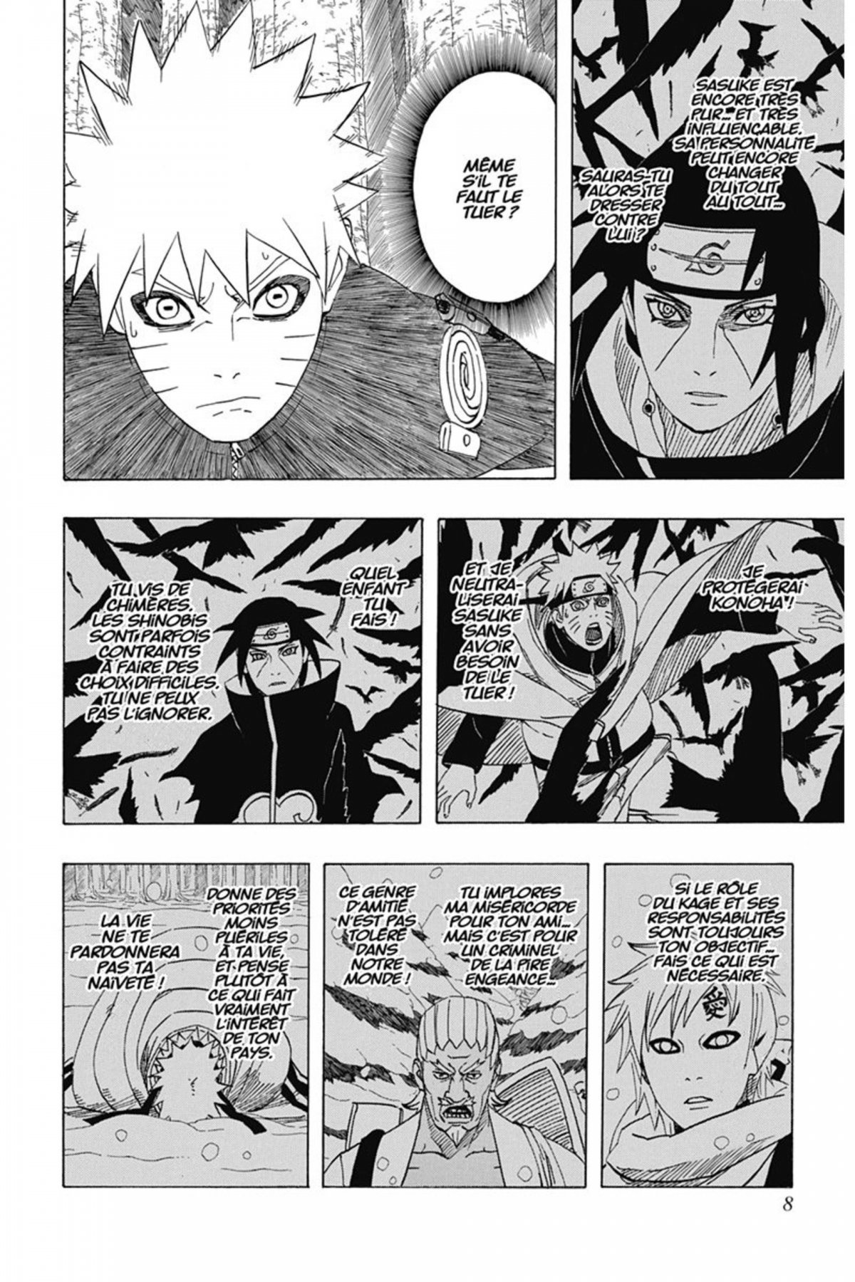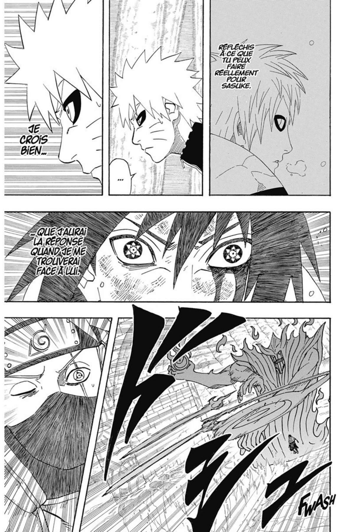Il est temps pour Naruto d’affronter Sasuke. Kakashi voudrait l’empêcher de risquer sa vie, en vain. Jusqu’à présent, Naruto était taraudé par le choix de tuer ou d’épargner Sasuke. Mais maintenant, sa décision est prise. Cependant, leur combat n’a même pas l’occasion de s’entamer, Madara et Zetsu interrompent leur altercation. Avant qu’il ne s’échappe avec ses complices, Naruto promet à Sasuke un combat duquel aucun d’eux n’en sortira vivant.