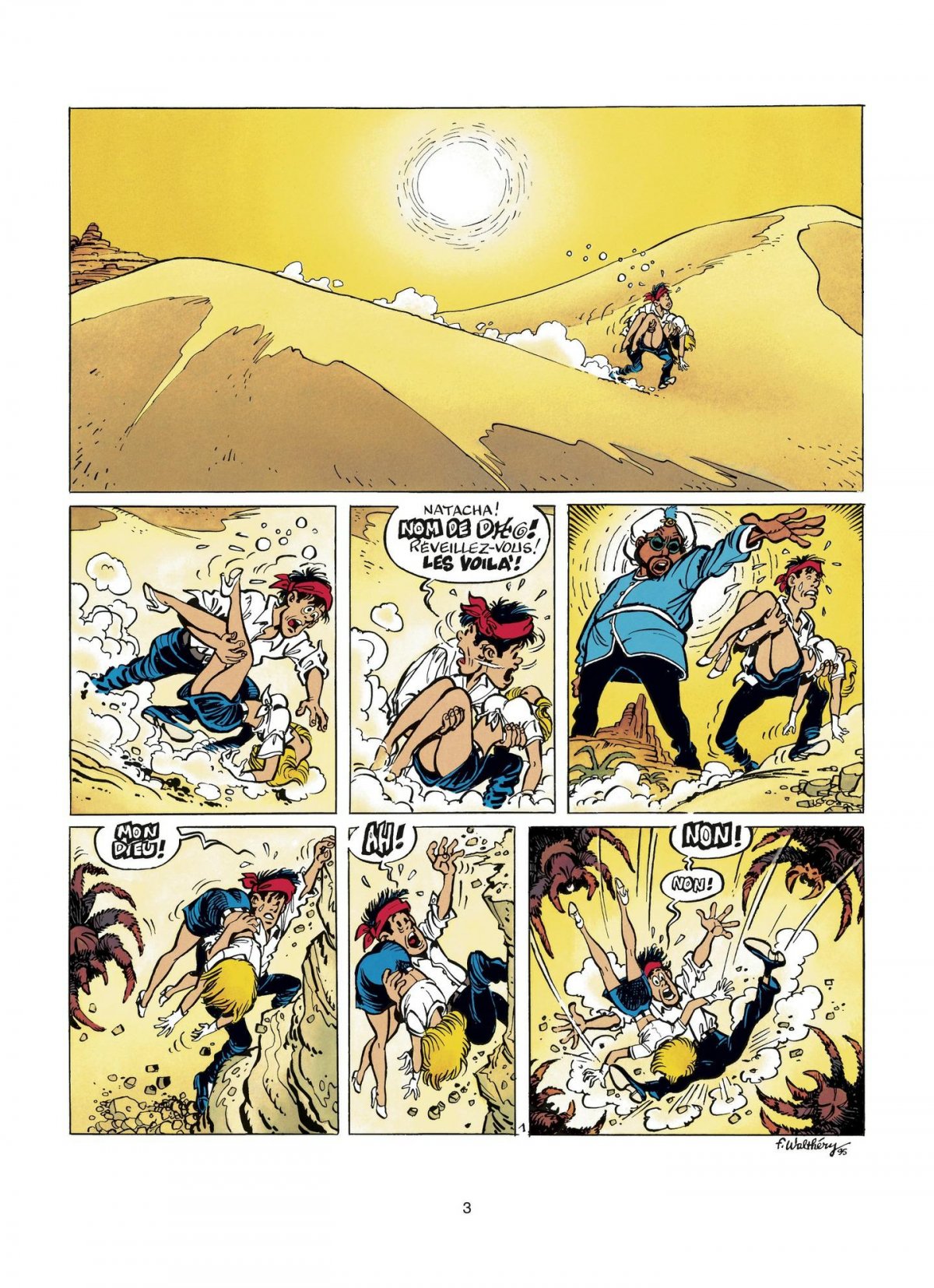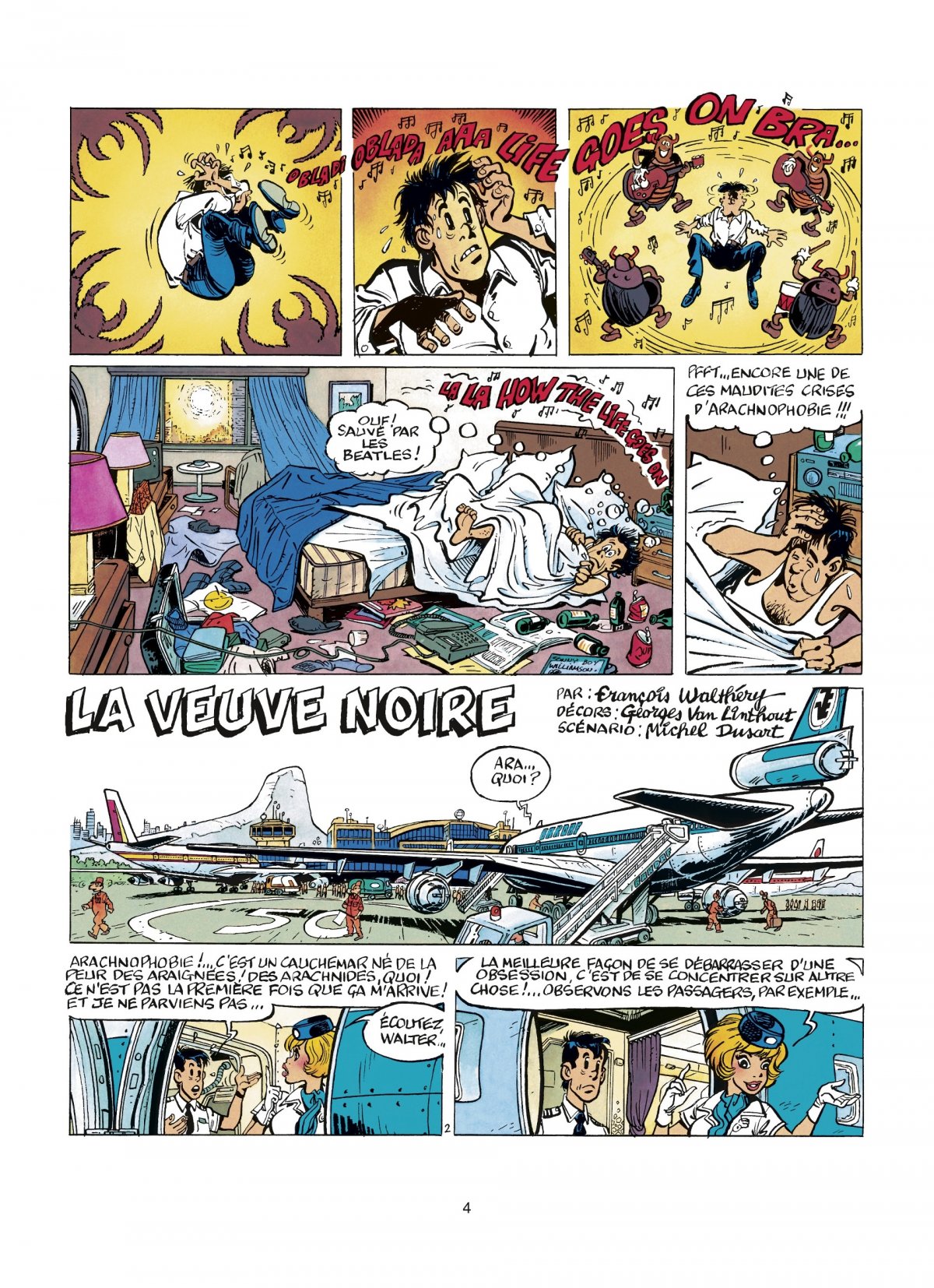 Natacha renoue avec une aventure aéronautique qui pourrait répondre à la règle de l’unité de temps, unité de lieu et unité d’action. Le début de l’épisode, au scénario très bien ficelé, se déroule dans un avion pendant un vol à destination d’Amérique latin. L’équipage et les passagers découvrent petit à petit que des animaux dangereux circulent dans sous les sièges : mygales, scorpions, serpents. Ceci provoque, petit à petit, une panique générale, surtout quand certains passagers sont piqués ou mordus, et des crises d’arachnophobie chez certains (dont Walter). Les soupçons concernant l’instigateur de cet attentat bien particulier, se portent sur une passagère aux cheveux noirs qui est affublée par la presse "people" du sobriquet de Veuve Noire (comme l’araignée), en rapport avec ses successifs mariages et veuvages avec des maris fortunés. Enfin, l’avion se posera enfin sur le sol américain, et Natacha découvrira l’identité du véritable coupable qu’elle poursuivra jusqu’au fin fond des bidonvilles latino-américains.