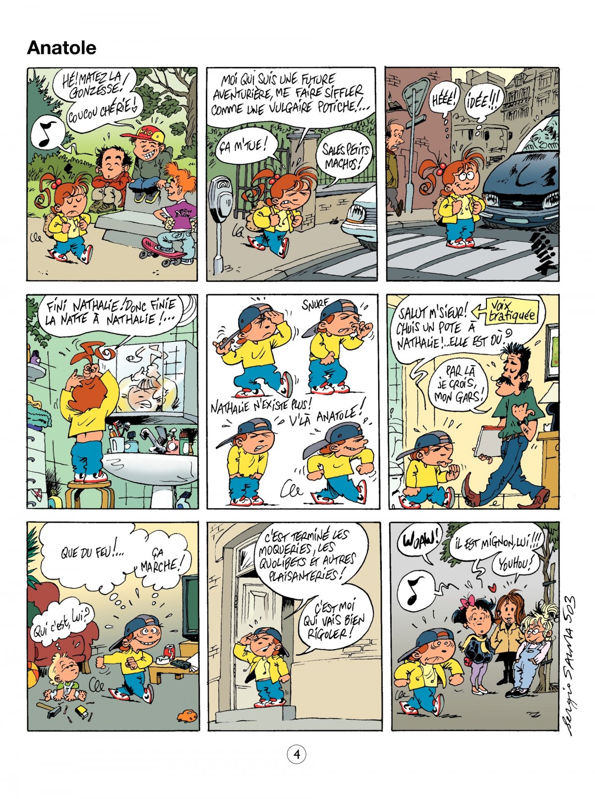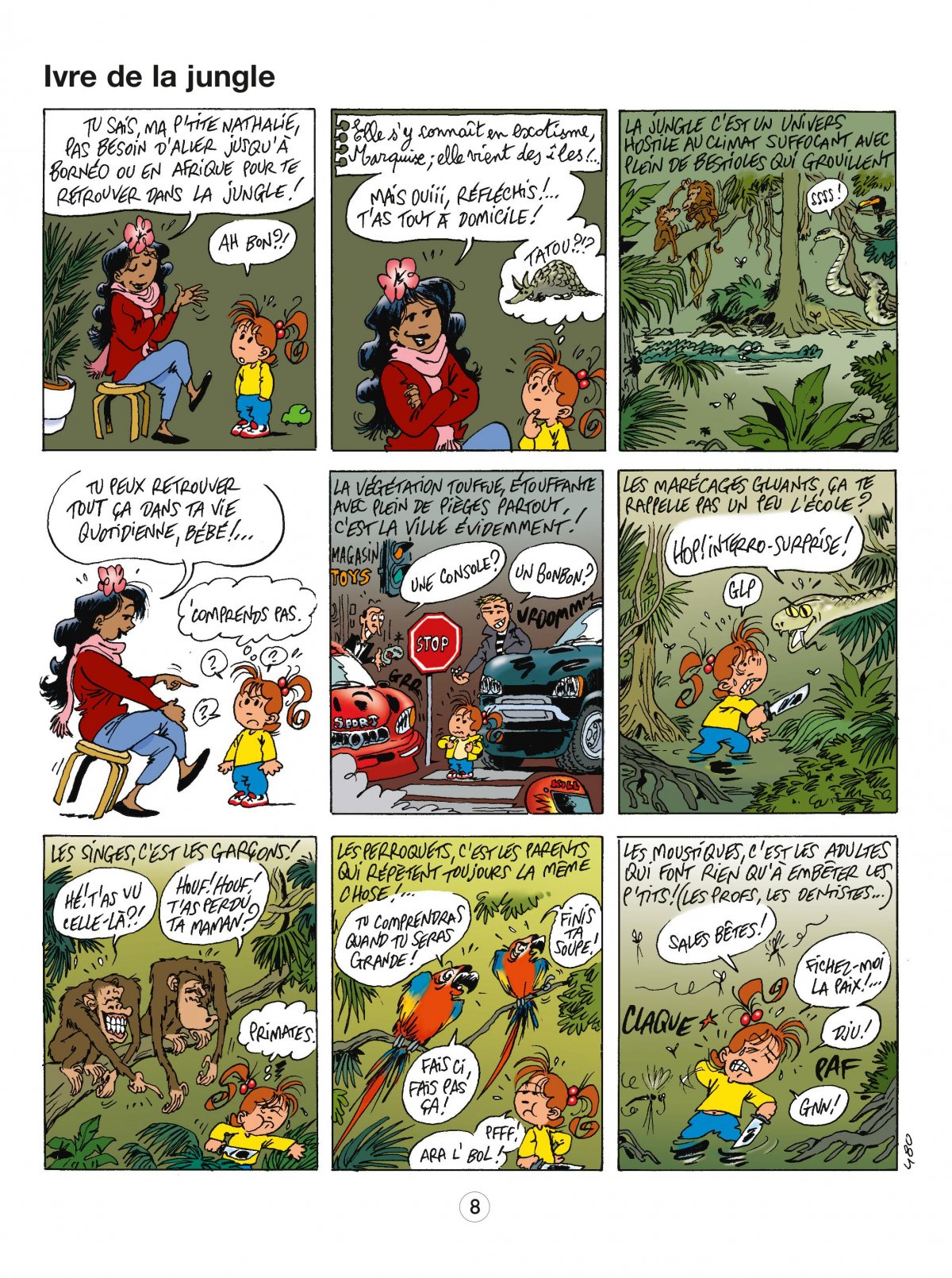 On ne présente plus Nathalie, cette petite fille modèle, adorée de ses parents, chérie par son oncle et exemple pour son petit frère... En réalité, Nathalie n’a que peu de points communs avec Martine ou les héroïnes de la comtesse de Ségur. Toujours aussi curieuse et imaginative, elle teste ses expériences, comme son humour, sur son entourage. Son oncle chômeur et baby-sitter, son frère en bas âge, sa mère perpétuellement au bord de la dépression ou son père (qui ne sait plus quoi faire), sont volontaires désignés d’office pour subir les facéties de Nathalie, jamais méchantes, mais souvent éprouvantes. Avec elle, les adultes n’ont qu’à bien se tenir, son esprit acéré étant toujours prêt à dévoiler l’absurdité de la vie quotidienne. Qu’elle se déguise pour Halloween avec sa maman ou se transforme en garçon, les aventures de Nathalie sont toujours à mi-chemin entre l’innocence de l’enfance et l’espièglerie naturelle de cette petite fille. Série tout publics, "Nathalie" plaît aussi bien aux enfants qu’aux moins jeunes, tant son humour est décapant et touche juste à chaque fois. Véritable bain de jouvence, Tu te fiches du monde ! rappelle à chacun les innombrables bêtises de l’enfance, tout à la fois agacantes et émouvantes.