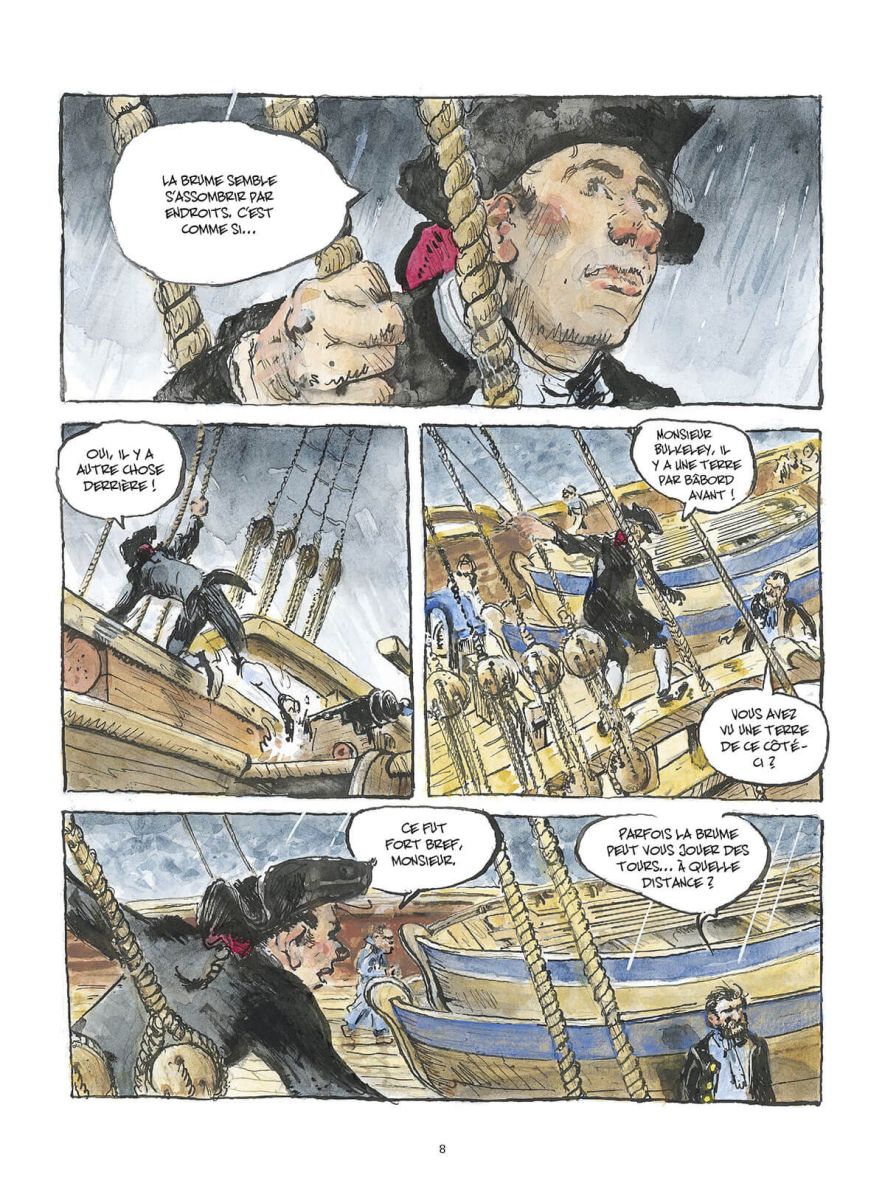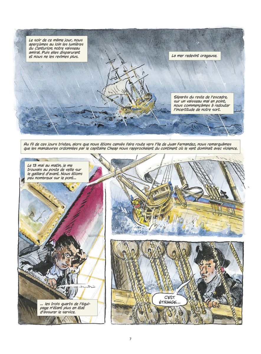 En septembre 1740, une escadre anglaise quitte Portsmouth à destination des mers du Sud. Son chef, le Commodore Anson, a pour mission d’attaquer et piller les prospères colonies espagnoles du Chili et du Pérou. Après une longue et pénible traversée de l’océan Atlantique, les vaisseaux atteignent le cap Horn à la mauvaise saison et subissent une succession de tempêtes qui les dispersent durablement. Après avoir raconté l’histoire de l’escadre du Commodore Anson, les auteurs se penchent sur le destin tragique d’un des navires, le Wager, d’après les souvenirs de John Byron, aspirant à bord du bateau et l’un des rares survivants. Un grand récit historique au souffle épique.