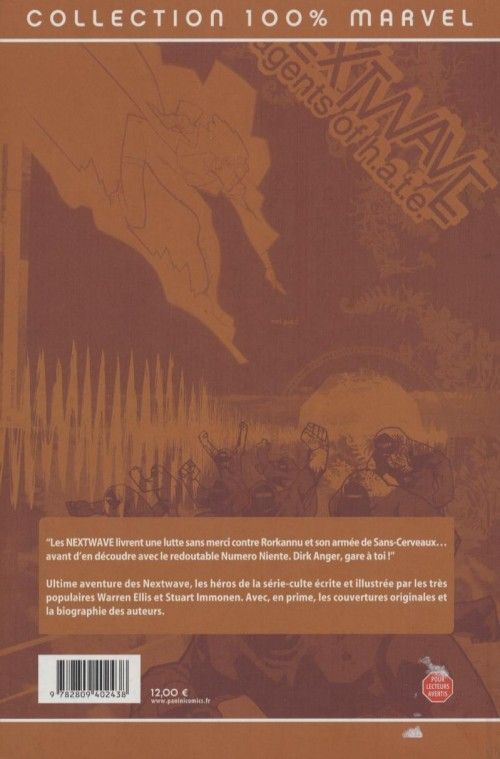 Conclusion cataclysmique de cette saga imaginée par Warren Ellis et Stuart Immonen. Les Nextwave, emmenés par l’ancien Vengeur Monica Rambeau, ont fort à faire avec le directeur déjanté de H.A.T.E., Dirk Anger. Soyez là !
