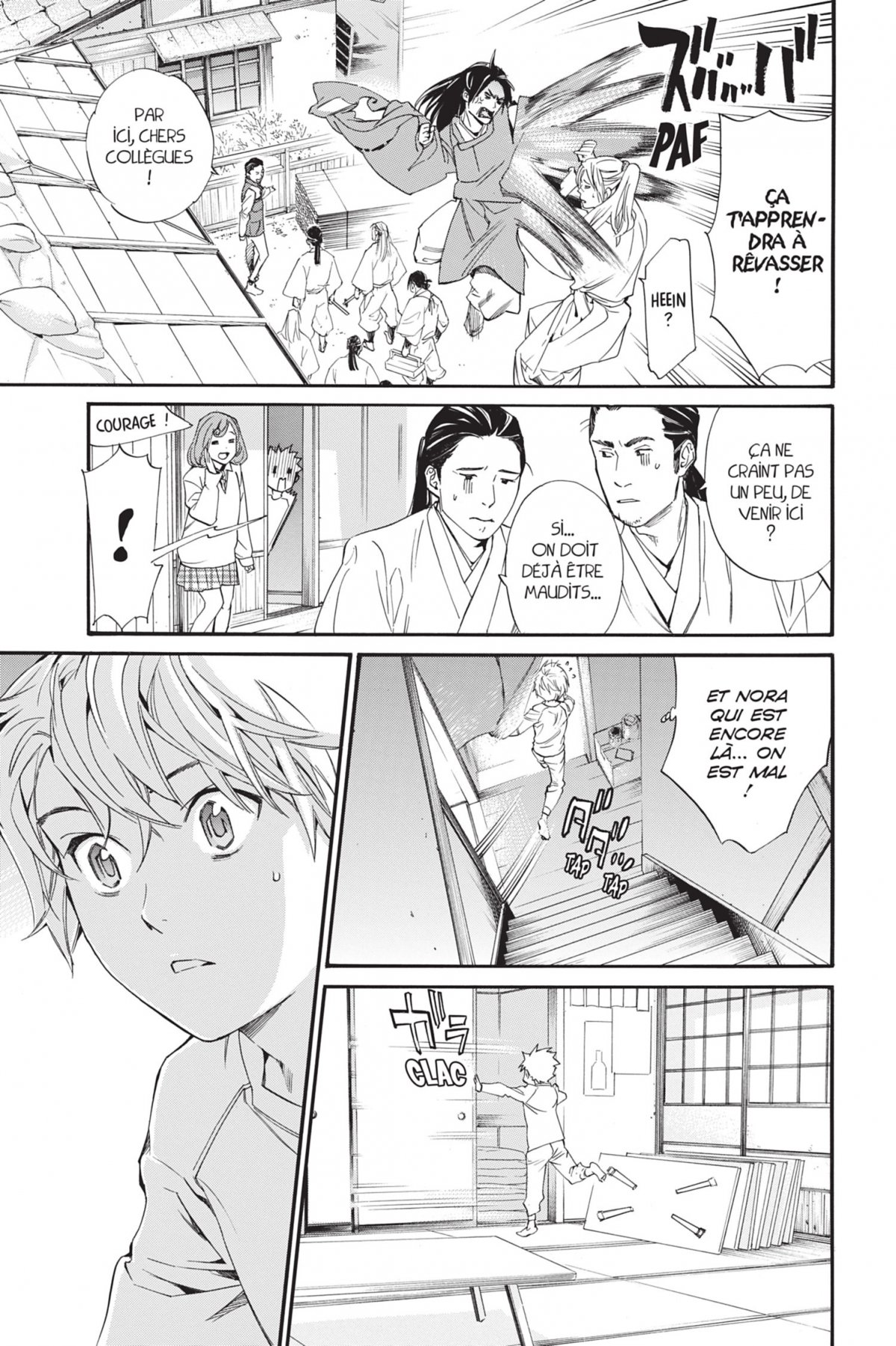 Alors qu ?il cherche Nora, qui est partie suite au retourde Kofuku, Yukine tombe sur Fujisaki. R ?volt ?, il luireproche de ne pas ?tre digne de son titre de p ?re, caril a abandonn ? ses propres enfants. Fujisaki prometde se tenir tranquille, le remercie m ?me de s ?occuperde Nora ? et fait allusion ? la mort de celle-ci, ce quipousse Yukine ? s ?interroger sur sa vie ant ?rieure !Hiyori a d ?cid ? de rester dans le monde des vivants,mais elle aussi fait finalement face au p ?re de Yato,qui l ?che alors ses chiens ?