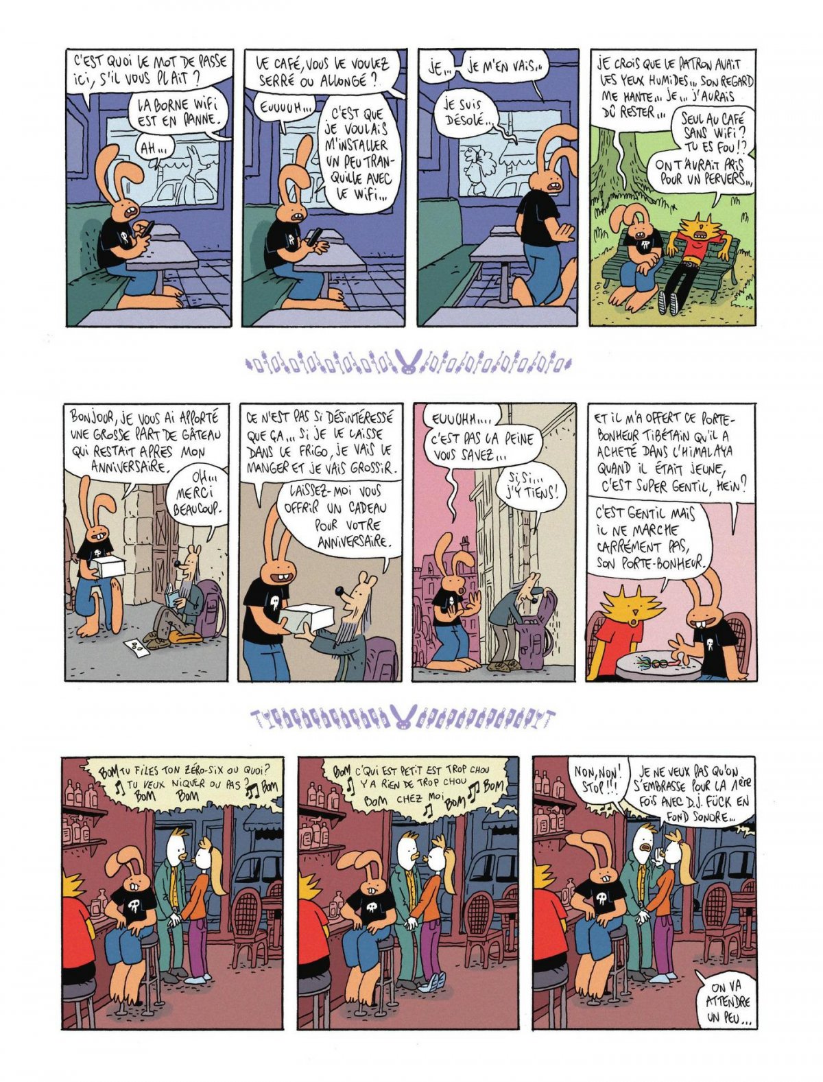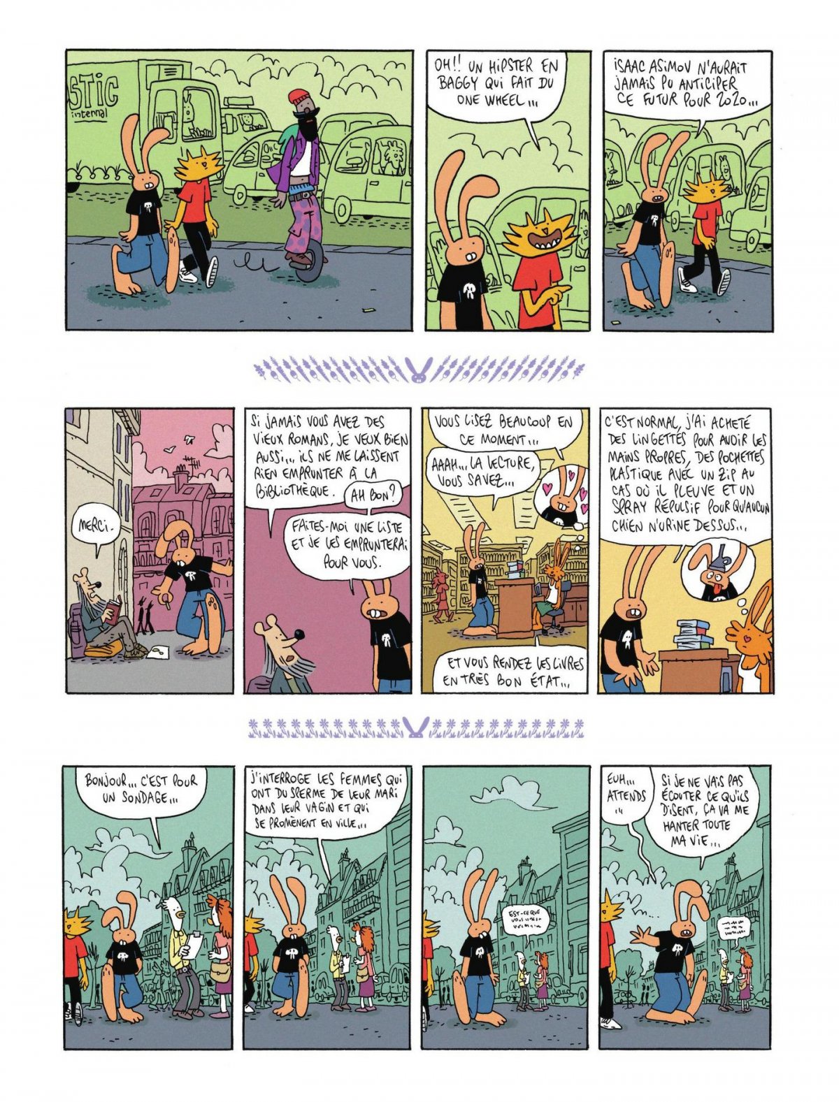 Lapinot, les mains derrière le dos, observe dans un cadre un strip de quatre cases : une créature se balade en harmonie avec son petit chien avant d’être terrorisée par un monstre qui finit par la prendre en affection. Un peu d’amour est un recueil de 125 strips dont le premier, placé en couverture de l’album, n’échappera pas à l’oeil du lecteur attentif. Faut-il voir dans ce strip initial une allusion à Lapinot, qui subit successivement la haine puis l’amour de Camille, bibliothécaire passionnée ?