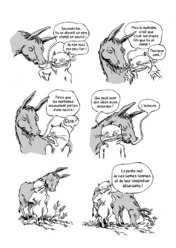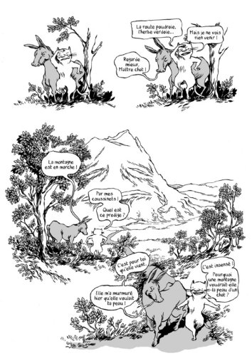 Et si Charles Perrault, pour le besoin de sa morale de fin, n’avait pas raconté toute l’histoire du Chat Botté ? Et si ce chat, manipulateur et égoïste, devenait à son tour victime des absurdités de ce conte ? En effet, suite à un jeu de mot cocasse, le chat se retrouve pourchassé par une montagne, persuadée qu’il a tué son fils, Ogre transformé en souris. Suit une course poursuite pas vraiment foudroyante, les Montagnes ne courant pas trop vite. Et le chat malin entre tous, trouvera sans doute, la solution à tous ses malheurs.