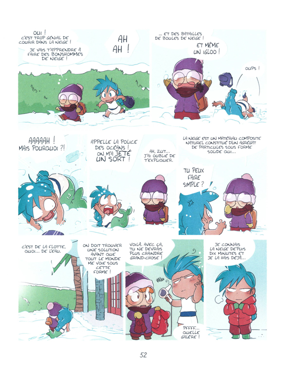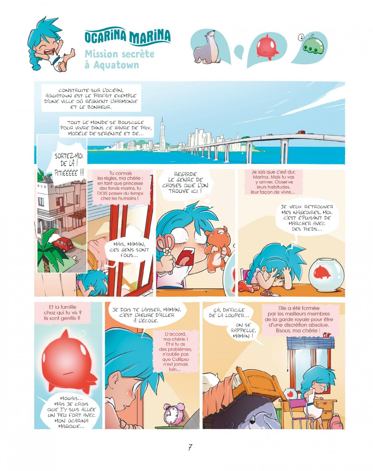 Marina est une sirène, mais pas n’importe laquelle ! Fille de la reine des mers, elle est la princesse du monde sous-marin... Sauf que, selon la tradition, elle doit passer un an sur terre incognito. Pas de souci, elle se déguise en vraie petite fille et envoûte une famille chez qui elle s’installe. Eh oui, elle a un ocarina magique autour du cou ! Mais il ne fonctionne pas sur le fils, Sacha, un petit binoclard de son âge. Et, surtout, si Marina rencontre la moindre goutte d’eau... Patatras ! Elle se retransforme aussitôt en sirène ! Et, justement, dans une ville construite sur l’eau, le danger est partout... Bref, entre son ennemie jurée Olly, la découverte d’Halloween et les problèmes que lui pose la neige, Marina ne risque pas de s’ennuyer ! Et vous non plus...