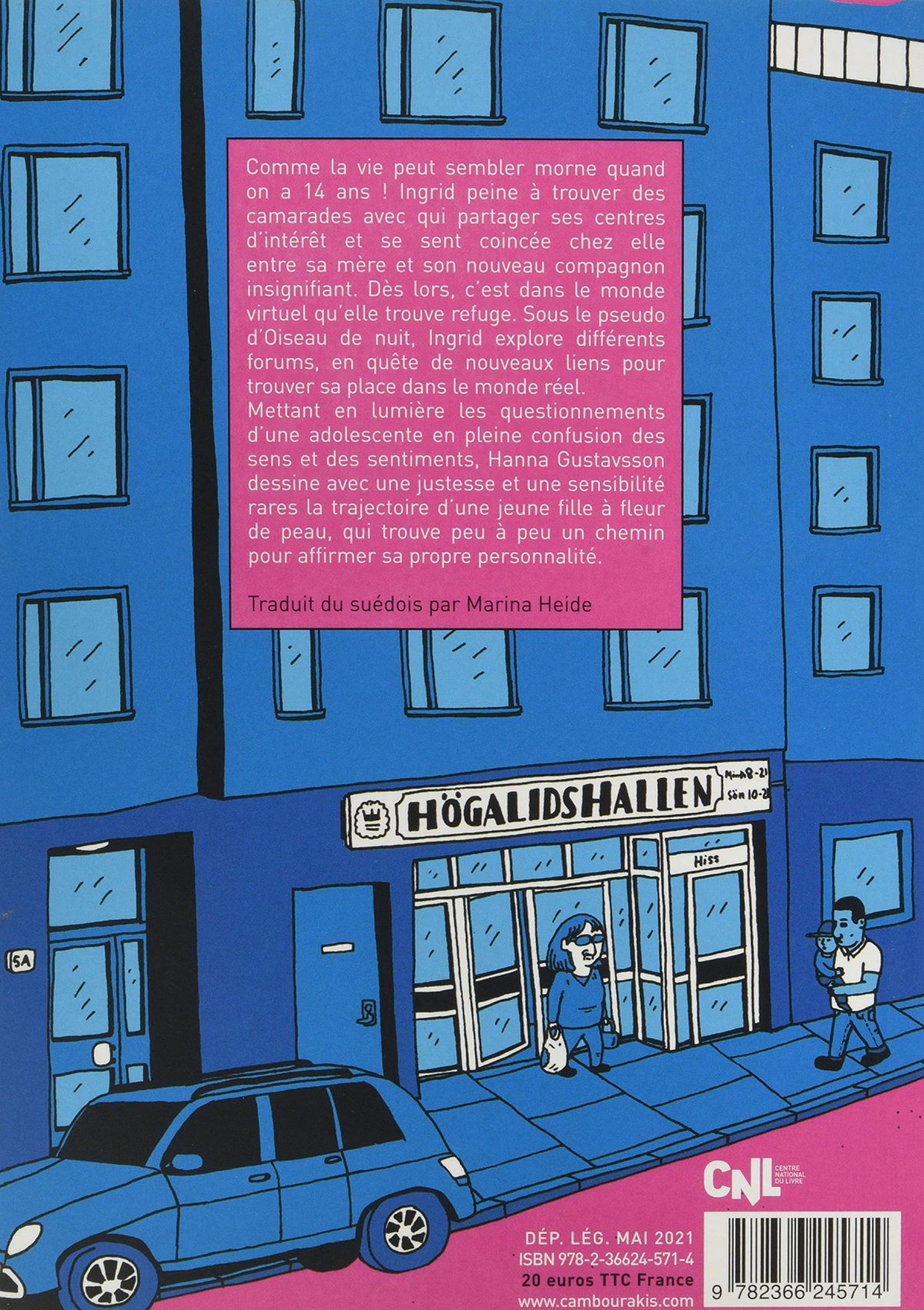 La première bande dessinée d’une des artistes les plus remarquables et remarquées de la scène underground suédoise, qui aborde avec une justesse rare la sensibilité et les questionnements d’une adolescente à fleur de peau : Ingrid a 14 ans et n’aspire qu’à ce qu’on la laisse tranquille. Sous le pseudo d’Oiseau de nuit, elle traîne sur différents forums internet quand elle n’est pas occupée à chercher des films pornos en ligne. C’est sa manière d’échapper à la morosité de son quotidien. Jusqu’à ce qu’elle rencontre un garçon plus âgé qui partage exactement les mêmes goûts musicaux qu’elle. Interrogations et confusion des sentiments s’ensuivent, le tout servi par un graphisme spontané extrêmement saisissant.