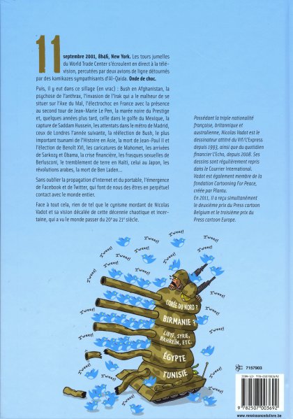 11 septembre 2001, 8h46, New York. Les tours jumelles du World Trade Center s’écroulent en direct à la télévision, percutées par deux avions de ligne détournés par des kamikazes sympathisants d’Al-Qaida. Onde de choc. Puis, il y eut dans ce sillage (en vrac) : Bush en Afghanistan, la psychose de l’anthrax, l’invasion de l’Irak qui a le malheur de se situer sur l’Axe du Mal, l’électrochoc en France avec la présence au second tour de Jean-Marie Le Pen, la marée noire du Prestige et, quelques années plus tard, celle dans le golfe du Mexique, la capture de Saddam Hussein, les attentats dans le métro de Madrid, ceux de Londres l’année suivante, la réélection de Bush, le plus important tsunami de l’Histoire en Asie, la mort de Jean-Paul II et l’élection de Benoît XVI, les caricatures de Mahomet, les arrivées de Sarkozy et Obama, la crise financière, les frasques sexuelles de Berlusconi, le tremblement de terre en Haïti, celui au Japon, les révolutions arabes, la mort de Ben Laden... Sans oublier la propagation d’Internet et du portable, l’émergence de Facebook et de Twitter, qui font de nous des êtres en perpétuel contact avec le monde entier. Face à tout cela, rien de tel que le cynisme mordant de Nicolas Vadot et sa vision décalée de cette décennie chaotique et incertaine, qui a vu le monde passer du 20e au 21e siècle.