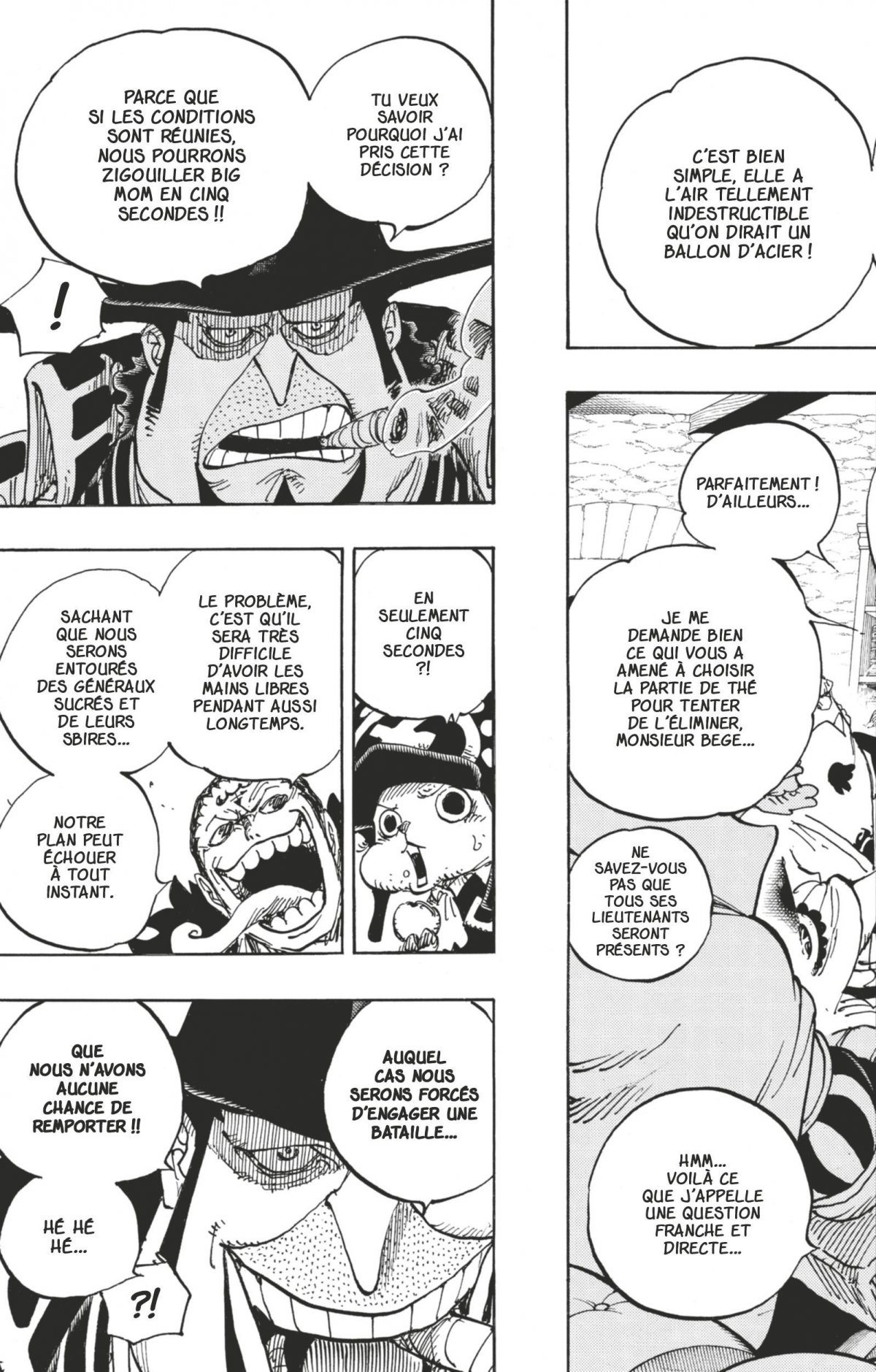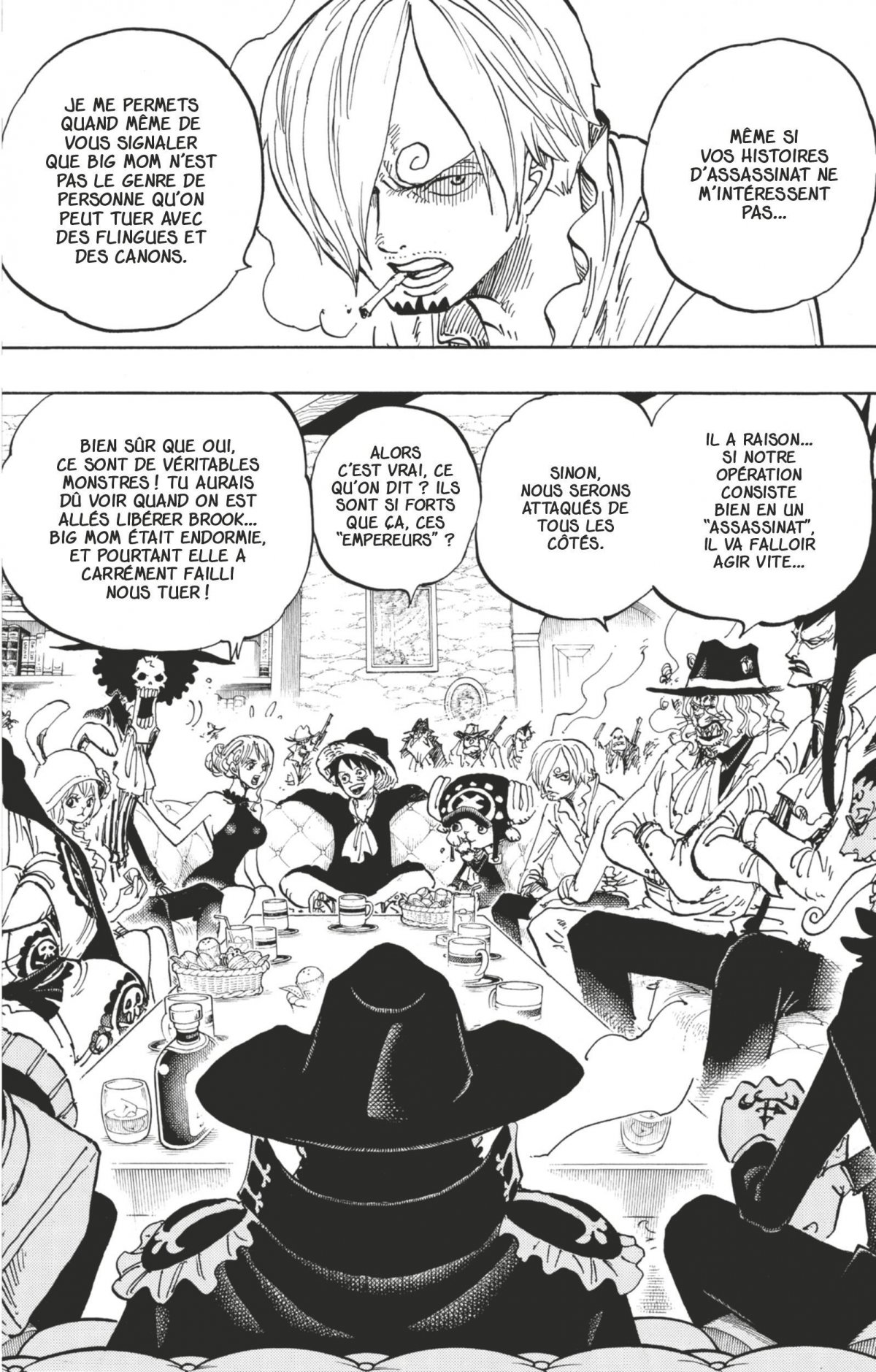 Capone détaille son projet d’assassinat contre Big Mom ! Hélas, pour espérer avoir une chance de blesser une femme aussi robuste, le seul moyen est de viser son point faible... Luffy et ses alliés viendront-ils à bout de leur terrible adversaire ?