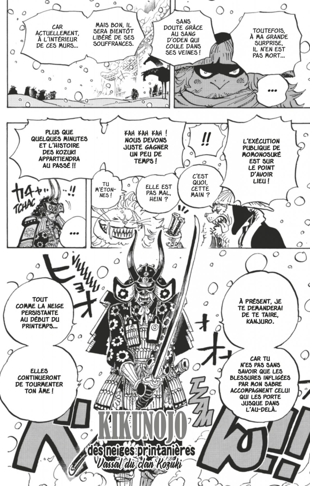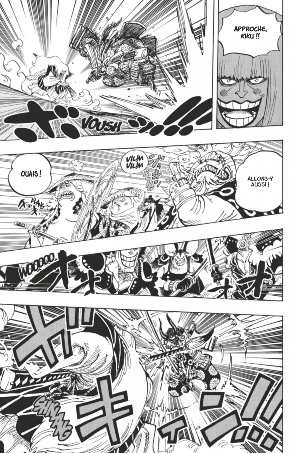 Kaido officialise son alliance avec Big Mom et révèle à ses hommes ce que sera la Nouvelle Onigashima qu’il appelle de ses voeux. Seulement, il ignore que les fourreaux rouges viennent de débarquer sur l’île et se dirigent droit vers lui ! Pendant ce temps, Luffy et son équipage tentent par tous les moyens de sauver Momonosuké dont l’exécution semble imminente. La bataille finale est sur le point de commencer !