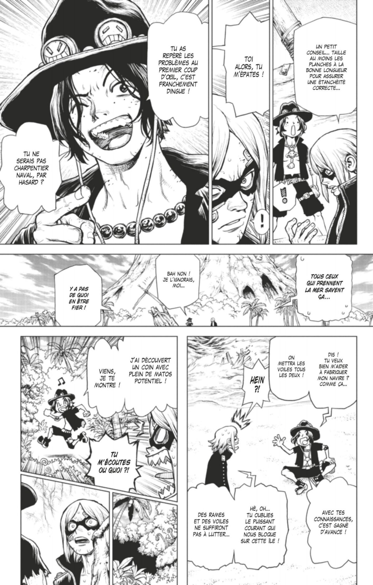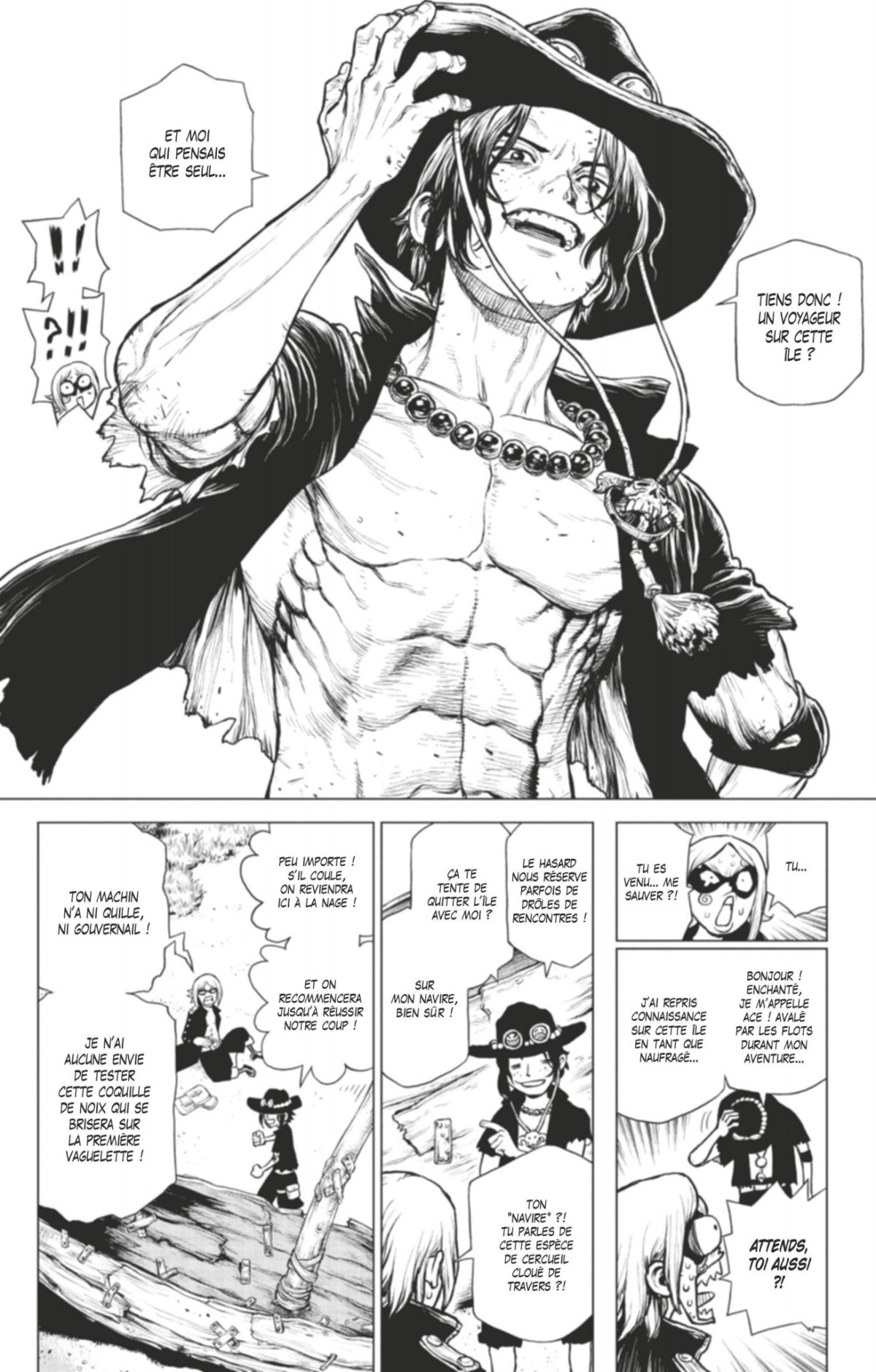 Luffy au chapeau de paille avait un frère, Ace aux poings ardents. Quel fut le passé de cet homme qui rêvait de graver son nom dans la légende ? Découvrez l’immense aventure de son existence ardente comme une flamme, depuis les événements qui conduisirent à la création de l’équipage du "Spade", le tout dessiné d’un trait de feu par le talentueux Boichi !! Ce volume comporte aussi la reprise par Boichi de Zoro tombe à l’eau, le chapitre 51 de One Piece !