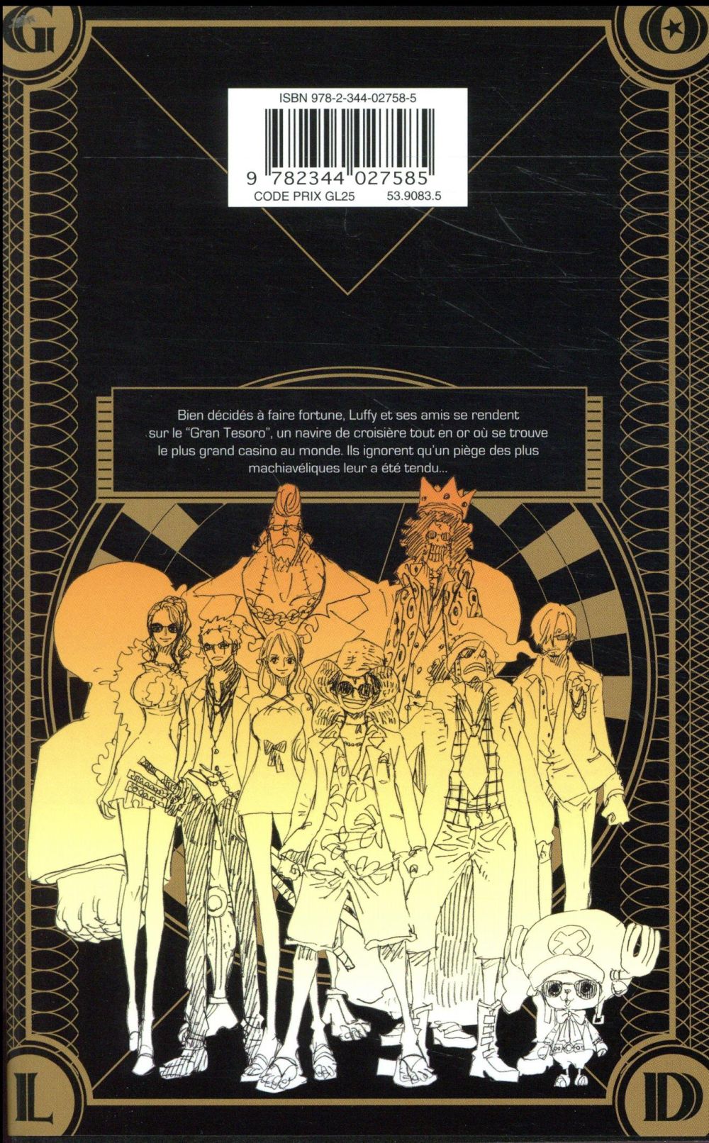 L’anime comics du film L’équipage de Chapeau de paille arrive sur Grantesoro, un navire accueillant les hommes les plus fortunés du monde dans son casino. Tout d’abord éblouis par le faste des lieux, Luffy et ses compagnons ne tardent pas à réaliser qu’un terrible piège les y attendait...Voici l’anime comics tant attendu du film One Piece Gold ! Entièrement supervisé par Eiichiro Oda, vous y découvrirez une aventure inédite qui viendra compléter agréablement la lecture de la série principale. À noter : une magnifique double couverture, illustrée par l’auteur lui-même !