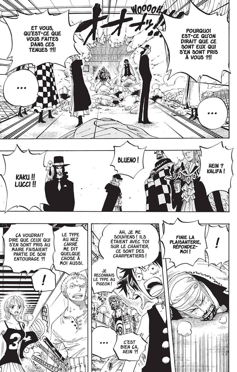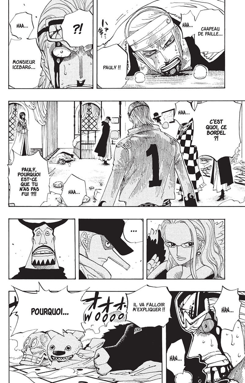 Luffy et ses amis vont-ils affronter les membres du CP9 pour éviter que Robin ne quitte l’équipage à jamais ?! Ces derniers se rendent chez Franky pour s’emparer des plans de l’arme antique Pluton , mais c’est alors qu’une terrible vérité éclate au grand jour !!