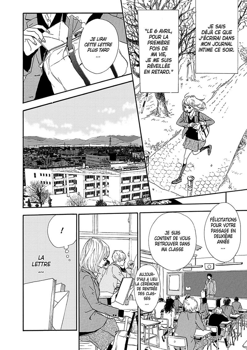 Un matin, alors qu’elle se rend au lycée, Naho reçoit une drôle de lettre : une lettre du futur ! La jeune femme qu’elle est devenue dix ans plus tard, rongée par de nombreux remords, souhaite aider celle qu’elle était autrefois à ne pas faire les mêmes erreurs qu’elle. Aussi, elle a décrit, dans un long courrier, les évènements qui vont se dérouler dans la vie de Naho lors des prochains mois, lui indiquant même comment elle doit se comporter. Mais Naho, a bien du mal à y croire, à cette histoire. Et de toute façon, elle manque bien trop d’assurance en elle pour suivre certaines directives indiquées dans ce curieux courrier. Pour le moment, la seule chose dont elle est sûre, c’est que Kakeru, le nouvel élève de la classe, ne la laisse pas indifférent.