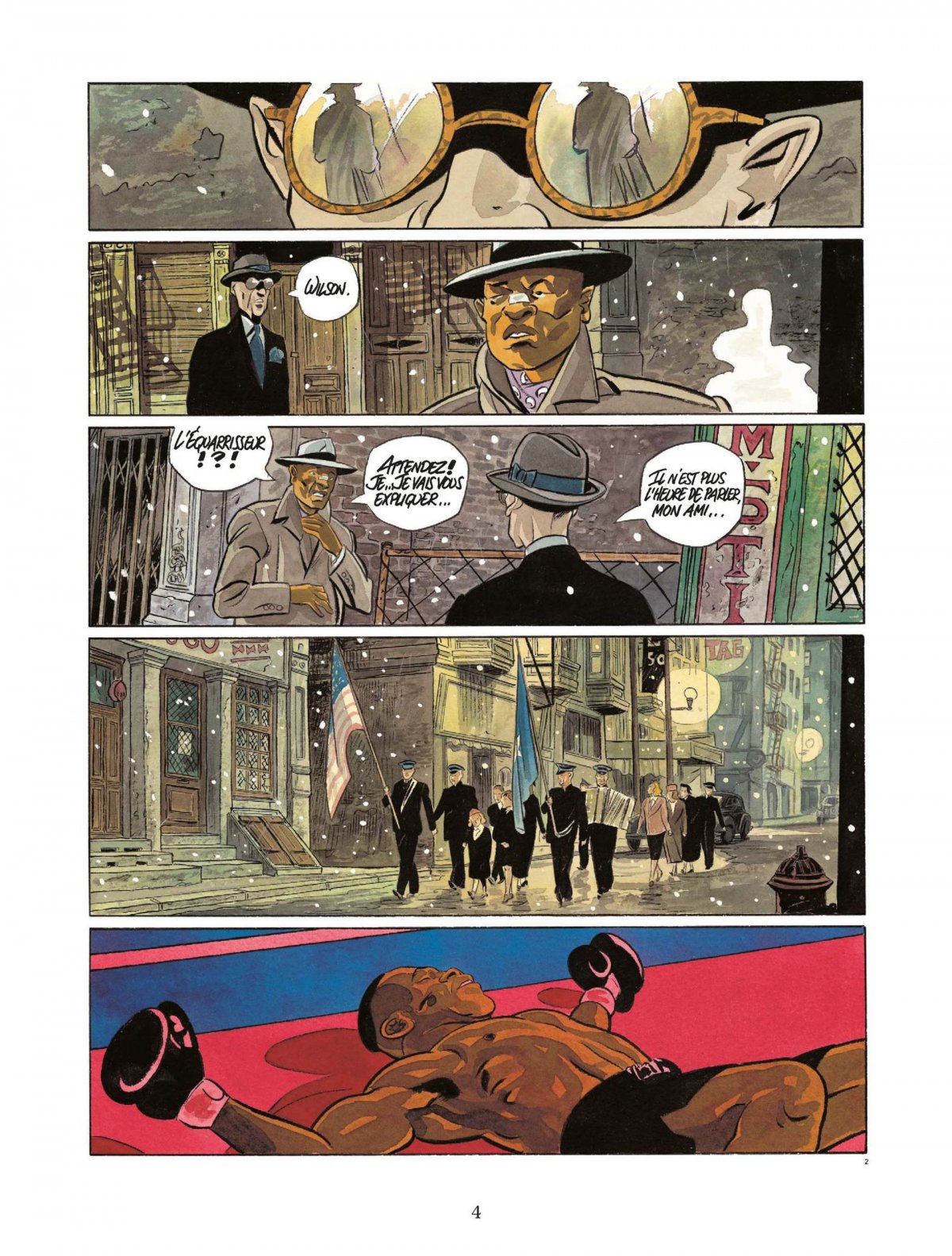 Après un détour à Hollywood, Charles-Albert Lafleur, dit l’Orfèvre, est de passage à New York. Il vient pour assister aux fiançailles de l’un de ses amis avec la fille d’un grand patron de presse. Elle est elle-même reporter en herbe et enquête sur une affaire qui remue la ville : ce soir, un jeune boxeur noir, Wilson Sniper, vient d’être assassiné juste après avoir mis K.O., et contre toute attente, le futur challenger du champion du monde. Il n’en faut pas plus à l’Orfèvre pour se lancer dans l’enquête en compagnie de mademoiselle Davenport. Plongeant dans l’obscurité des secrets bien gardés du milieu, l’Orfèvre va découvrir que le combat était truqué et que Sniper devait se coucher à la quatrième reprise... Mais il n’a pas respecté lesrègles, mettant K.O. son adversaire à la troisième... Pourquoi ? Et lorsque l’Orfèvre découvre ensuite le cadavre du coach de Sniper, l’affaire se complique...Ambiance 30’s, boxeurs noirs, chanteuses de jazz, cabarets enfumés, femmes superbes, pègre, grands buildings s’élevant à perte de vue, on ne s’est jamais senti autant dans cette époque envoûtante qu’en dévorant le nouveau Warnauts et Raives. K.O. sur ordonnance est une histoire complète absolument remarquable tant par son dessin, ses cadrages, son scénario que ses couleurs.