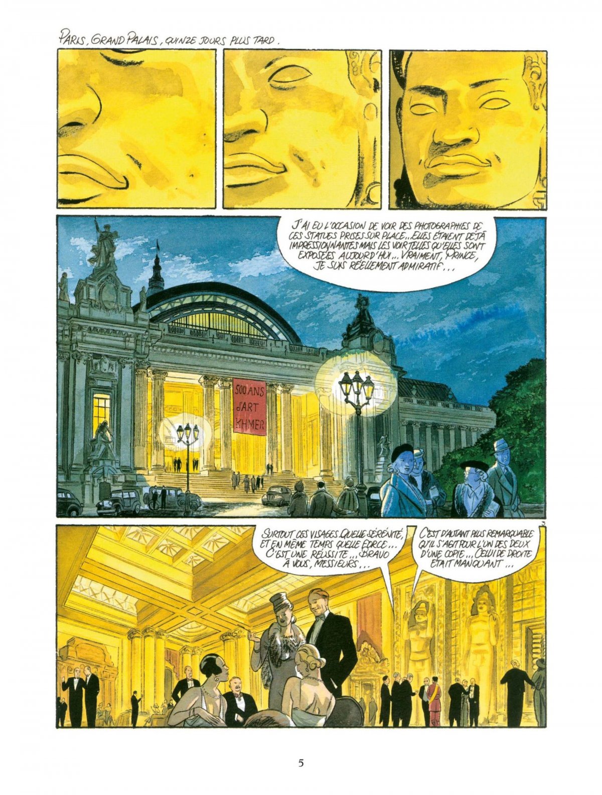 Un petit port de Bretagne. Lors du déchargement du navire « Le Perle de Siam », une caisse s’écroule, dévoilant non seulement un bouddha de jade, mais aussi une grosse quantité d’opium...15 jours plus tard, au Grand Palais, à Paris... Une exposition consacrée à l’art Khmer réunie du beau monde, dont le policier Charles-Albert Lafleur ainsi que le Prince du Cambodge. Ce dernier ne tarde pas à demander une faveur à l’Orfèvre : il a besoin d’opium car son épouse, Soyan, en est dépendante. Lafleur s’exécute, s’attirant par la même occasion l’amitié du Prince. C’est ensuite qu’il va enquêter sur cette histoire de bateau mystérieusement déchargé de nuit. La tête d’un bouddha aurait disparu... Menant son investigation, l’Orfèvre va peu à peu voir des cadavres jalonner son parcours... Il n’est qu’au début de ses surprises...C’est cette fois en France, et principalement à Paris, que se déroule la nouvelle enquête de l’Orfèvre. Une série remarquable, tant par son dessin, ses cadrages, son scénario que ses couleurs, qui nous replonge avec délice et authenticité dans des années 30 sulfureuses et agitées.
