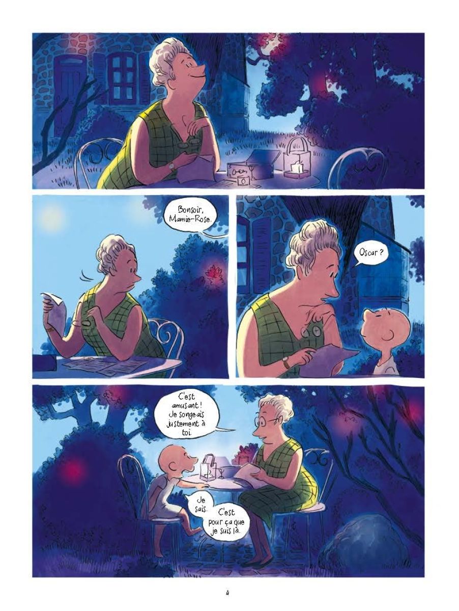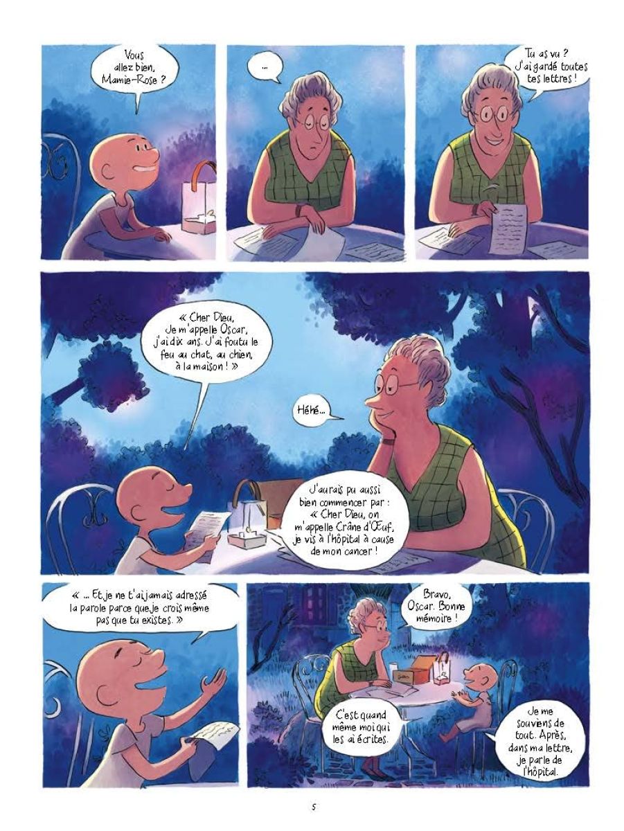 Sur sa terrasse, une douce soirée d’été, Mamie-Rose relit les lettres qu’Oscar a écrites à Dieu. Elle sourit en pensant à ce petit garçon dont elle fut si proche.« Bonsoir, Mamie-Rose ».La vieille dame relève la tête : « Oscar ? C’est amusant... Je songeais justement à toi. » Mamie-Rose vit et échange avec ses souvenirs, plus vivants que jamais. La tendresse entre ces deux-là est infinie, l’un exprimant toute sa colère face à l’injustice de la maladie, l’autre camouflant ses sentiments sous sa brusquerie d’ancienne catcheuse. Bouleversant.