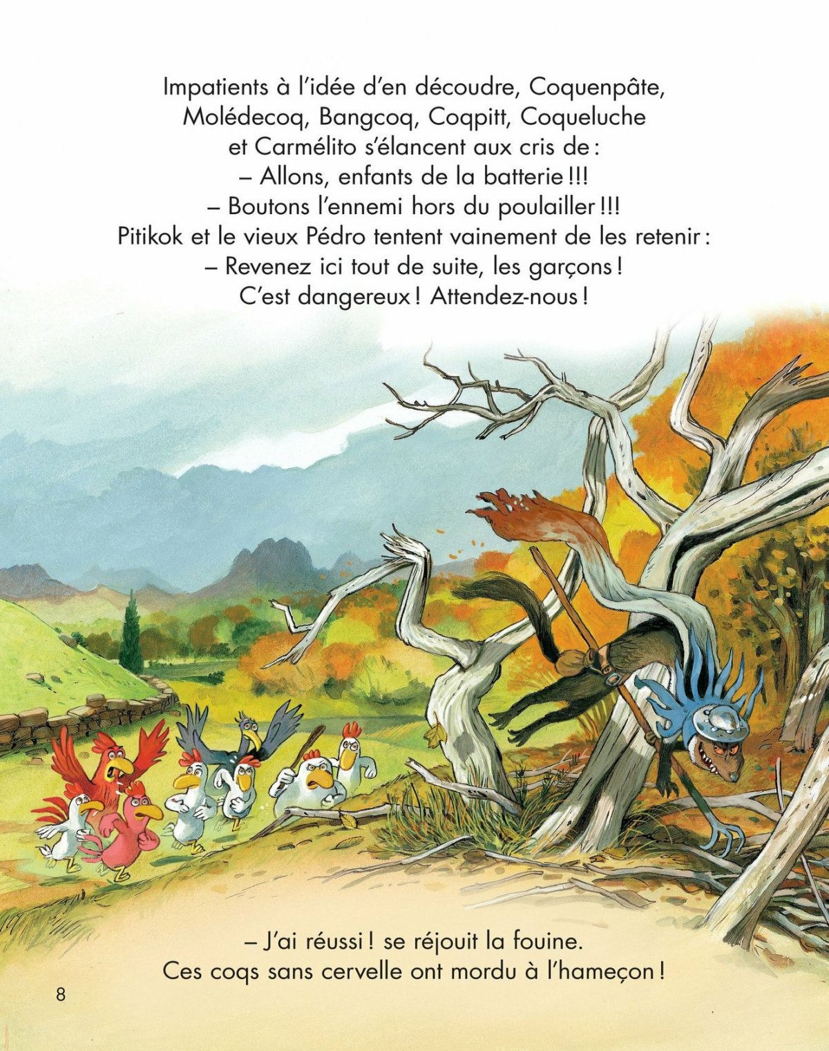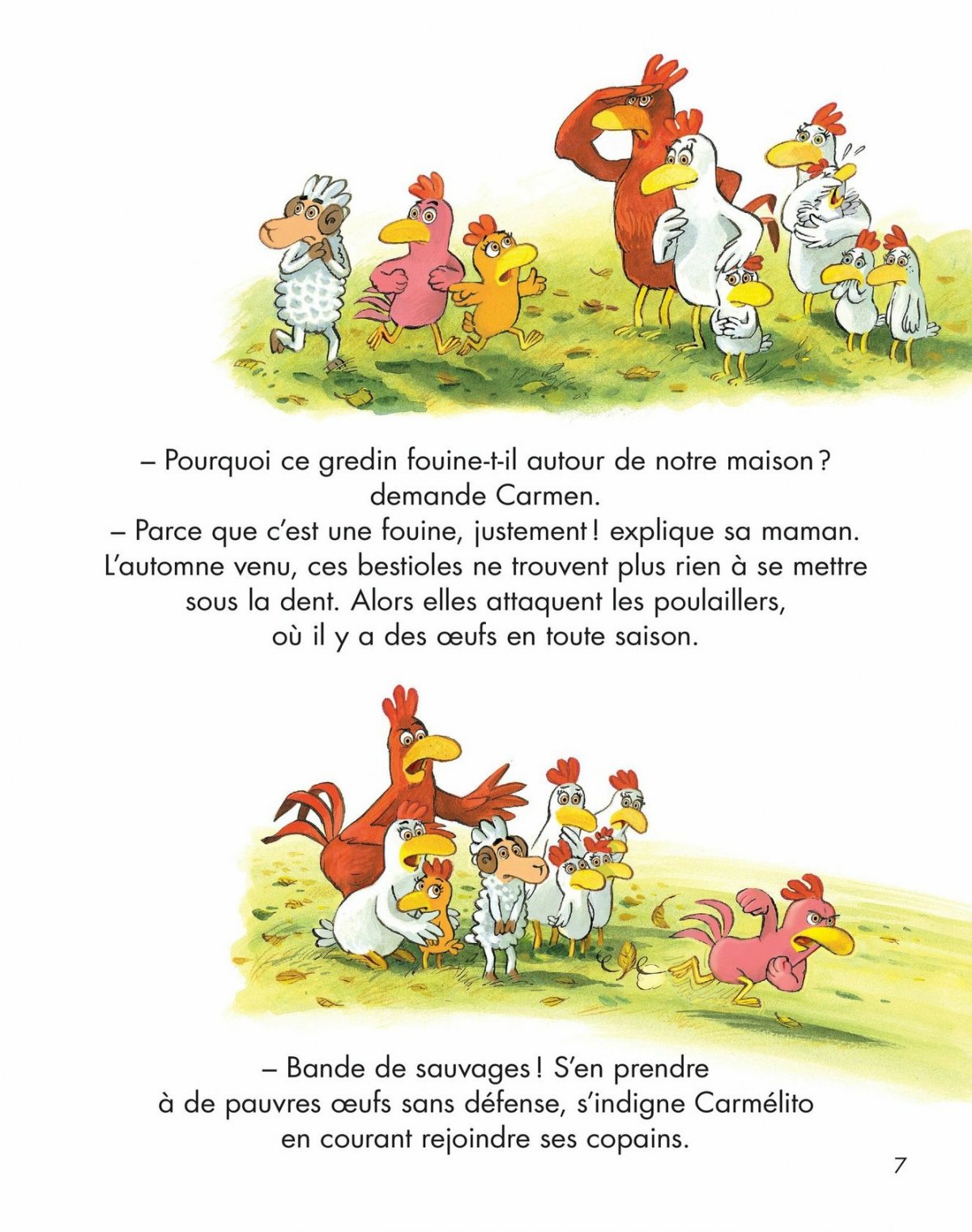 Ce jour-là, les petites poules et leurs mamans sont restées seules au poulailler. Et voilà qu’une bande de fouines les attaque sauvagement. Les lâches ! S’en prendre à de pauvres poulettes sans défense ! En l’absence de Carmélito et des petits coqs, les filles réussiront-elles à repousser les terribles prédateurs ?