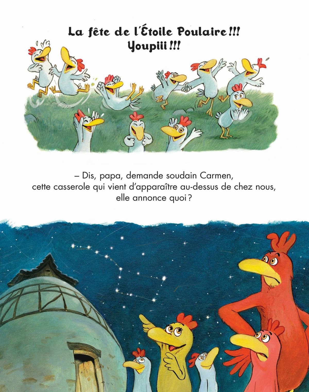 Cette nuit-là, une chose étrange apparaît dans le ciel au-dessus du poulailler : une grande casserole ! Pour Pédro le Cormoran, c’est un sinistre présage. Sauve-qui-poule général à la basse-cour ! Carmen, Carmélito, Bélino et leurs copains vont tous finir à la casserole ! C’est alors qu’ils croisent sur leur chemin un colporteur venu d’Orient. L’étonnant voyageur a dans ses bagages une merveille qui va chambouler la vie des P’tites Poules...