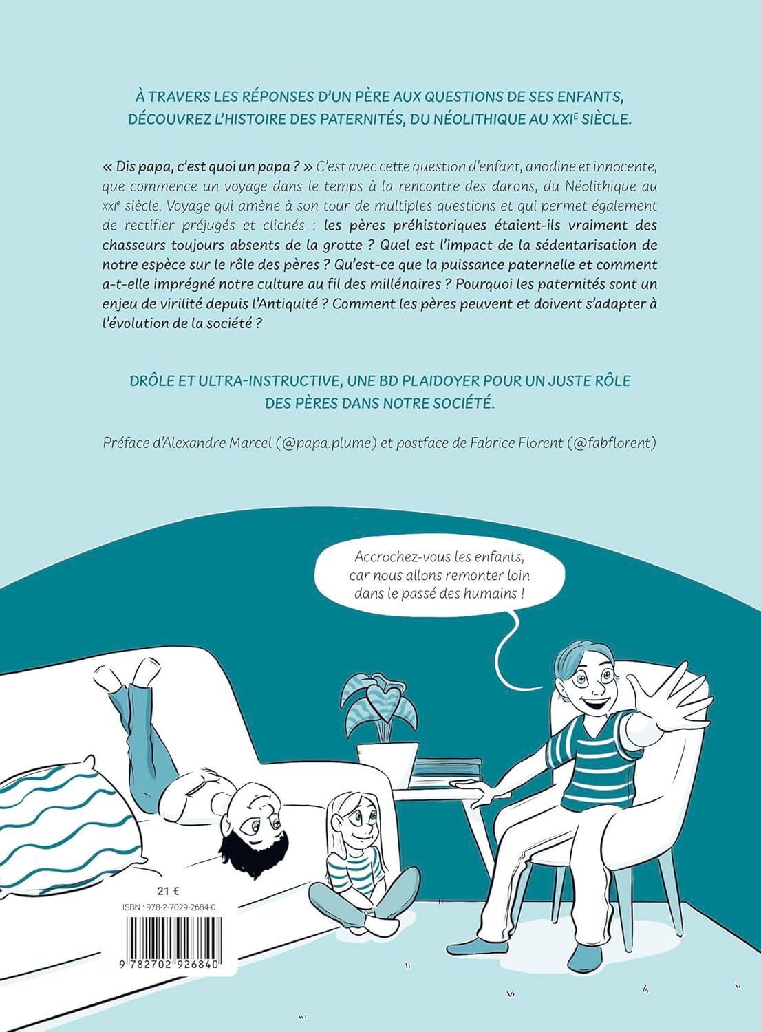 " Dis papa, c’est quoi un papa ? " C’est avec cette question d’enfant, anodine et innocente, que commence un voyage dans le temps à la rencontre des darons, du Néolithique au XXIe siècle. Voyage qui amène à son tour de multiples questions et qui permet également de rectifier préjugés et clichés : les pères préhistoriques étaient-ils vraiment des chasseurs toujours absents de la grotte ? Quel est l’impact de la sédentarisation de notre espèce sur le rôle des pères ? Qu’est-ce que la puissance paternelle et comment a-t-elle imprégné notre culture au fil des millénaires ? Pourquoi les paternités sont un enjeu de virilité depuis l’Antiquité ? Comment les pères peuvent et doivent s’adapter à l’évolution d’une société plus juste ?