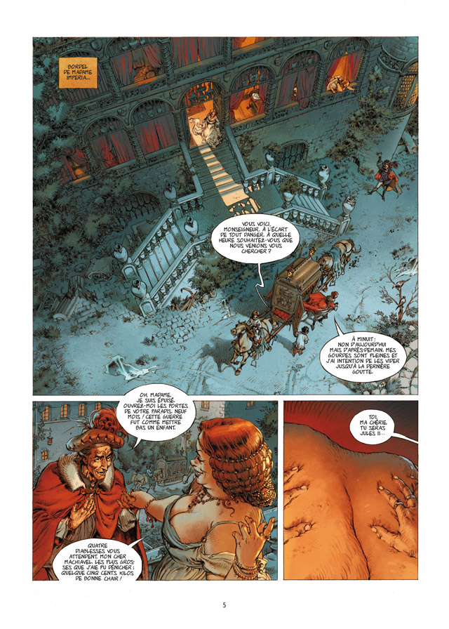 Revenu de guerre, Machiavel profite de se ressourcer au bordel de Madame Imperia pour conter les campagnes victorieuses de Jules II. Campagnes militaires puis amoureuses puisque Michel- Ange a accepté le chantier de la Sixtine et de partager la couche du Saint-Père en compagnie de son rival Raphaël. Mais dans l’ombre, une autre bataille a commencé : les cardinaux veulent organiser le prochain conclave...