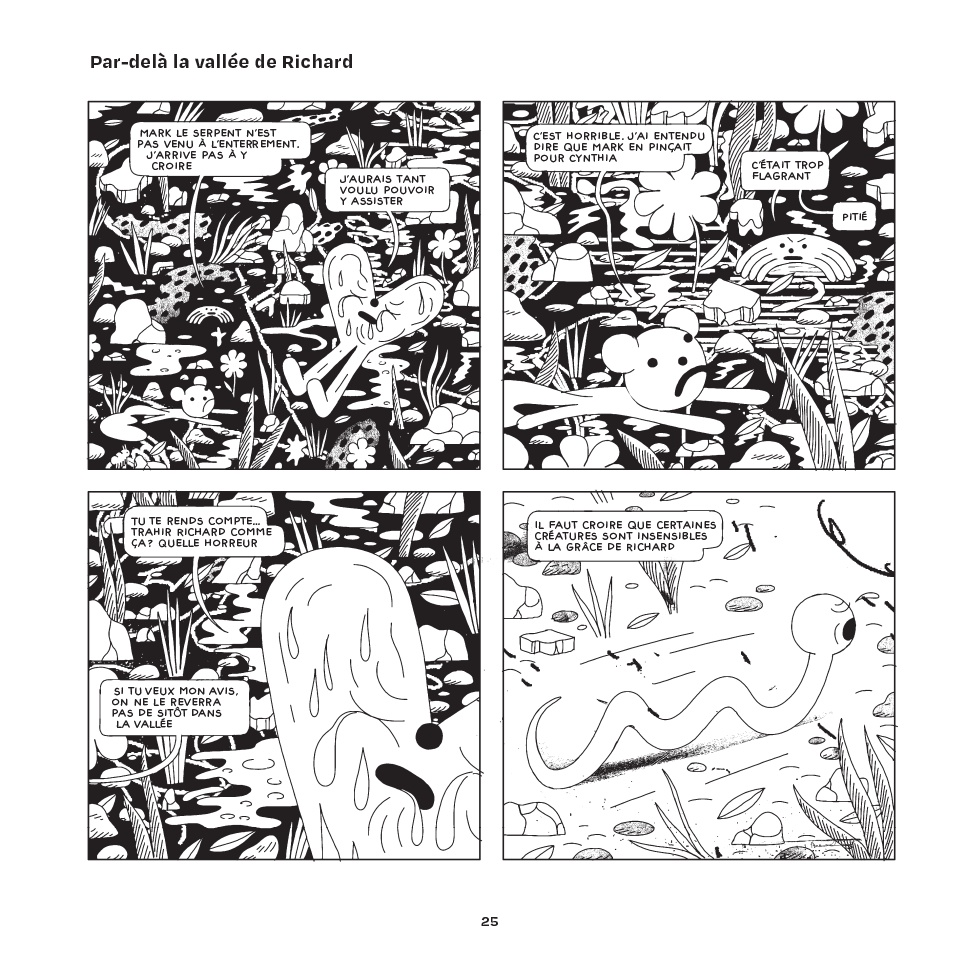 Lyle, Neville, Ellie Ecureuil et Omar l’araignée ont désobéi à Richard et le verdict est sans appel : ils doivent quitter la vallée, sans espoir de retour. En quittant la vallée de Richard et en se dirigeant vers la ville, le petit groupe va faire moult rencontres - bonnes comme mauvaises - alors qu’en parallèle le lecteur en apprendra un peu plus sur le charismatique mais despotique Richard. Gentrification, mécanisme sectaire, starification et animaux parlants, voilà quelques éléments du nouveau livre de l’insaisissable et toujours surprenant Michael DeForge.
