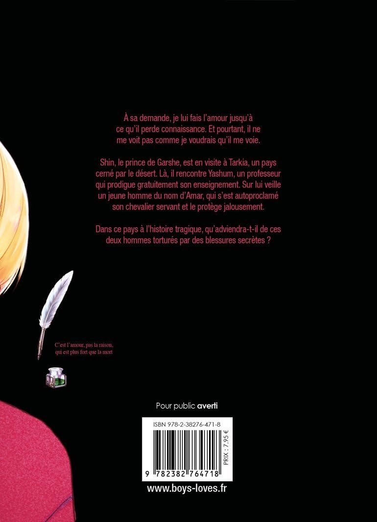 À sa demande, je lui fais l’amour jusqu’à ce qu’il perde connaissance. Et pourtant, il ne me voit pas comme je voudrais qu’il me voie.Shin, le prince de Garshe, est en visite à Tarkia, un pays cerné par le désert. Là, il rencontre Yashum, un professeur qui prodigue gratuitement son enseignement. Sur lui veille un jeune homme du nom d’Amar, qui s’est autoproclamé son chevalier servant et le protège jalousement. Dans ce pays à l’histoire tragique, qu’adviendra-t-il de ces deux hommes torturés par des blessures secrètes ?
