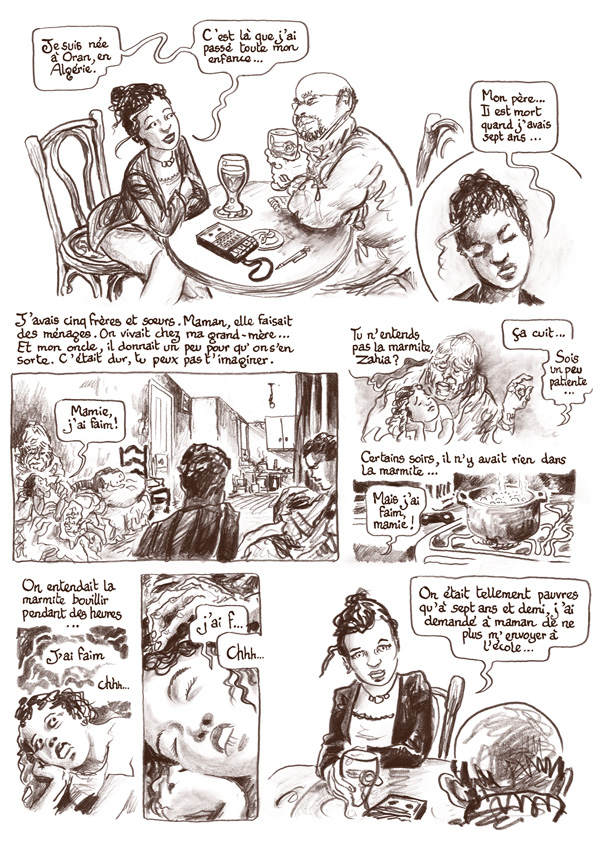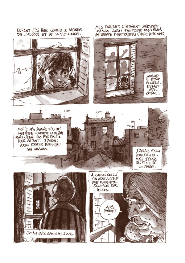 " Enfant, j’ai bien connu le monde de l’alcool et de la violence. Mes parents s’étaient séparés. Maman avait retrouvé un copain. Un pauvre type, toujours entre deux vins. Quand il était bourré, fallait qu’il cogne. Moi, il ne m’a jamais touché, faut être honnête là-dessus, mais c’était pas plus facile pour autant. J’aurais voulu pouvoir défendre ma maman. J’aurais voulu pouvoir, oui. "" Je suis née et j’ai vécu mon enfance à Oran. Mon père. il est mort quand j’avais 7 ans. J’avais 5 frères et soeurs. Maman, elle faisait des ménages. On vivait chez ma grand-mère. Et mon oncle, il donnait un peu pour qu’on s’en sorte. C’était dur, tu ne peux pas t’imaginer. "" A cause de leur travail, mes parents m’ont placé chez une nourrice, pendant les trois premières années de ma vie. Cette femme avait un gamin, qui était bègue. Sans le faire exprès, je me suis mis à imiter sa façon de parler. Quand mes parents m’ont repris avec eux, le mal était fait. J’ai jamais réussi à me défaire de ce bégaiement. "