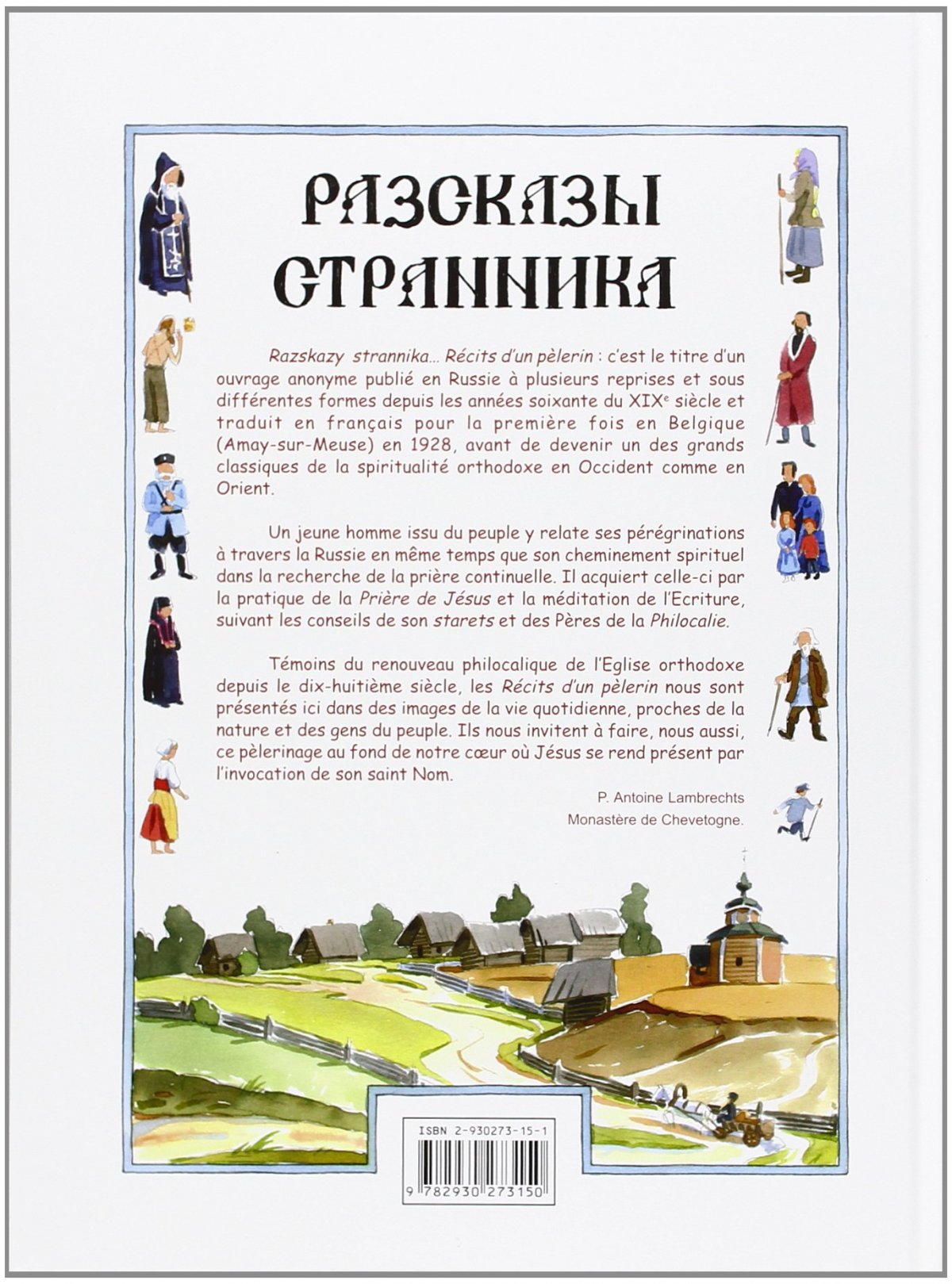 Razskazy strannika... Récits d’un pèlerin C’est le titre d’un ouvrage anonyme publié en Russie à plusieurs reprises et sous différentes formes depuis les années soixante du XIXème siècle et traduit en français pour la première fois en Belgique (Amay-sur-Meuse) en 1928, avant de devenir un des grands classiques de la spiritualité orthodoxe en Occident comme en Orient. Un jeune homme issu du peuple y relate ses pérégrinations à travers la Russie en même temps que son cheminement spirituel dans la recherche de la prière continuelle. Il acquiert celle-ci par la pratique de la Prière de Jésus et la méditation de l’Ecriture, suivant les conseils de son starets et des Pères de la Philocalie. Témoins du renouveau philocalique de l’Eglise orthodoxe depuis le dix-huitième siècle, les Récits d’un pèlerin nous sont présentés ici dans des images de la vie quotidienne, proches de la nature et des gens du peuple. Ils nous invitent à faire, nous aussi, ce pèlerinage au fond de notre cœur où Jésus se rend présent par l’invocation de son saint Nom. P. Antoine Lambrechts, Monastère de Chevetogne