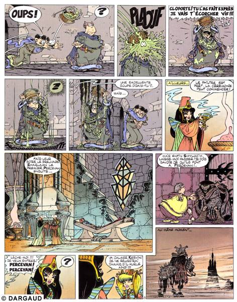Grâce à la magie de Balkis, l’esprit de Shalaan quitte son corps de vieillard fripé pour investir le corps jeune et vigoureux de Percevan, associant ainsi ses pouvoirs mentaux à la fougue du chevalier. Dans un décor lugubre, sous une pluie torrentielle, il prend le chemin du château de Malicorne avec le fidèle Kervin qui n’apprécie guère le transfert, regrette "son" Percevan et parsème le voyage de commentaires discourtois : "Môssieu se dégonfle, Môssieu n’est qu’un faiseur"..